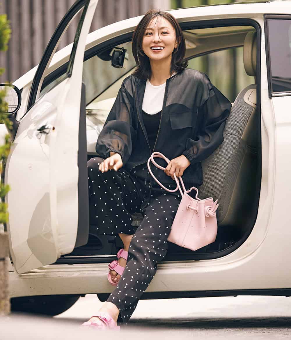 ブルゾン¥16,500(PLST)Tシャツ¥20,000(TW)パンツ¥45,100(サードマガジン)バッグ¥51,700(ヴァジック/ヴァジックジャパン)靴¥9,900(ビルケンシュトック/ビルケンシュトック・ジャパン カスタマーサービス)ピアス各¥25,300(ともにマユ/マユ ショールーム)