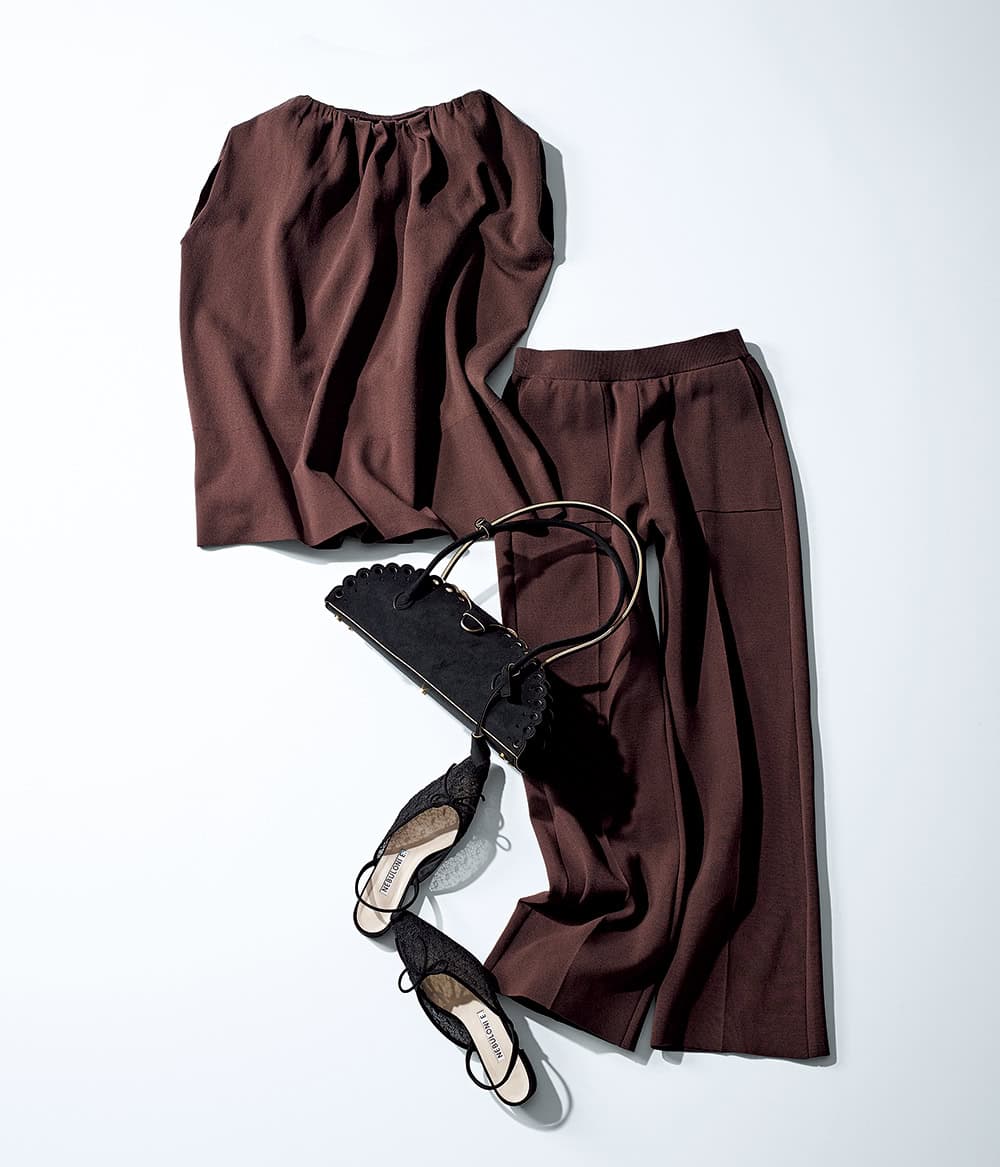 ブラウンと黒は最強の色合わせ。例えば仕事の場面には、ピリッと黒の小物で引き締めて。ニットトップス¥30,800ニットパンツ¥30,800〈ともにマルティニーク〉バッグ¥47,300〈メアリーオルターナ〉パンプス¥63,800〈ネブローニ〉(すべてマルティニーク ルミネ横浜)