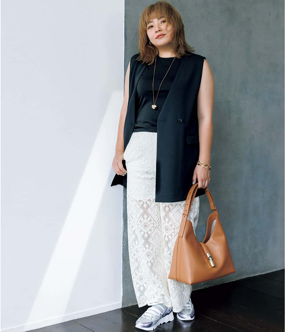 ジレ¥9,990(アンフィーロ)タンクトップ¥5,390(エルーラ/アダストリア)パンツ¥29,700(アダム エ ロペ)バッグ¥58,300(フルラ/フルラ ジャパン)スニーカー¥111,100(ピエール アルディ/ピエール アルディ 東京)ピアス¥77,000(ウノアエレ/ウノアエレ ジャパン)ネックレス¥9,020(ピルグリム/ZUTTOHOLIC)ブレスレット¥37,800(アビステ)