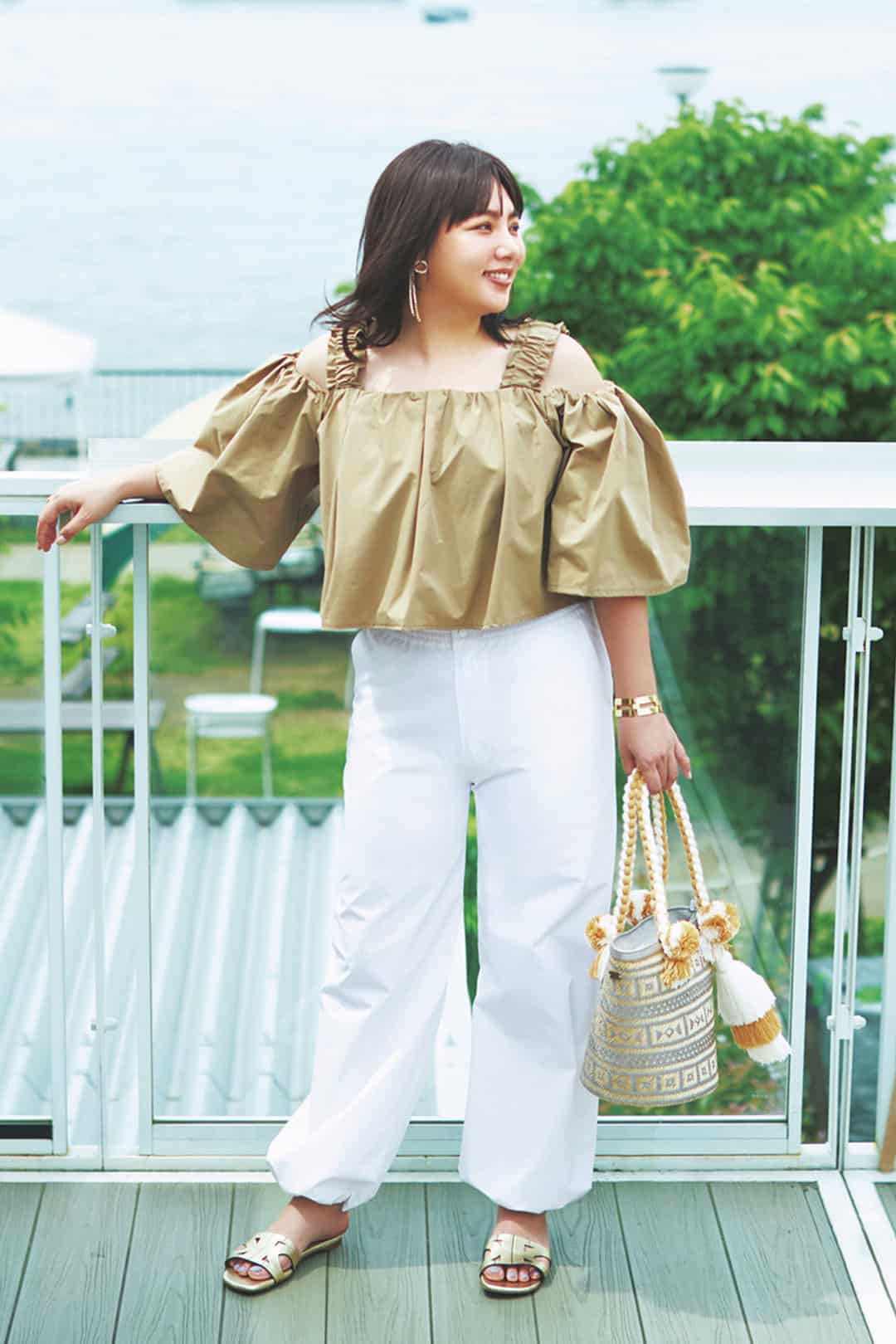 キュッと締まったバルーン型の裾が可愛い白パンツは、ポワンとした構築的なシルエットでボディラインをカバー。トップスには華やかな盛り袖ブラウスを合わせて、シルエットにメリハリをつけて。上半身にボリュームを出すことで、自然と脚周りの細見えが狙えます。自信のあるデコルテの肌見せで、コーデに艶と抜け感をプラス。