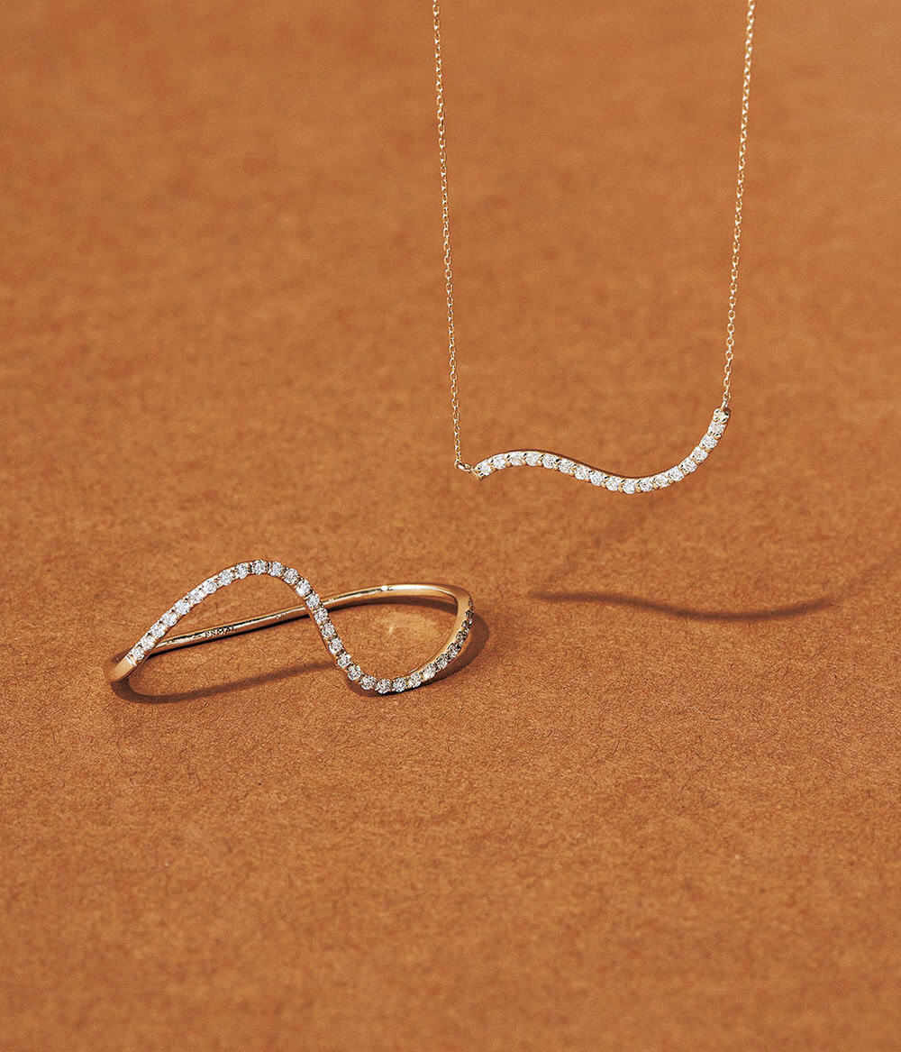 環境にやさしいラボグロウダイヤをたっぷりちりばめた逸品。〈右から〉ネックレス〈YG×DIA〉リング〈YG×DIA〉(ともにプライマル)