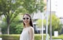 スカートスタイルもアイウェアのおかげでグッとモードに