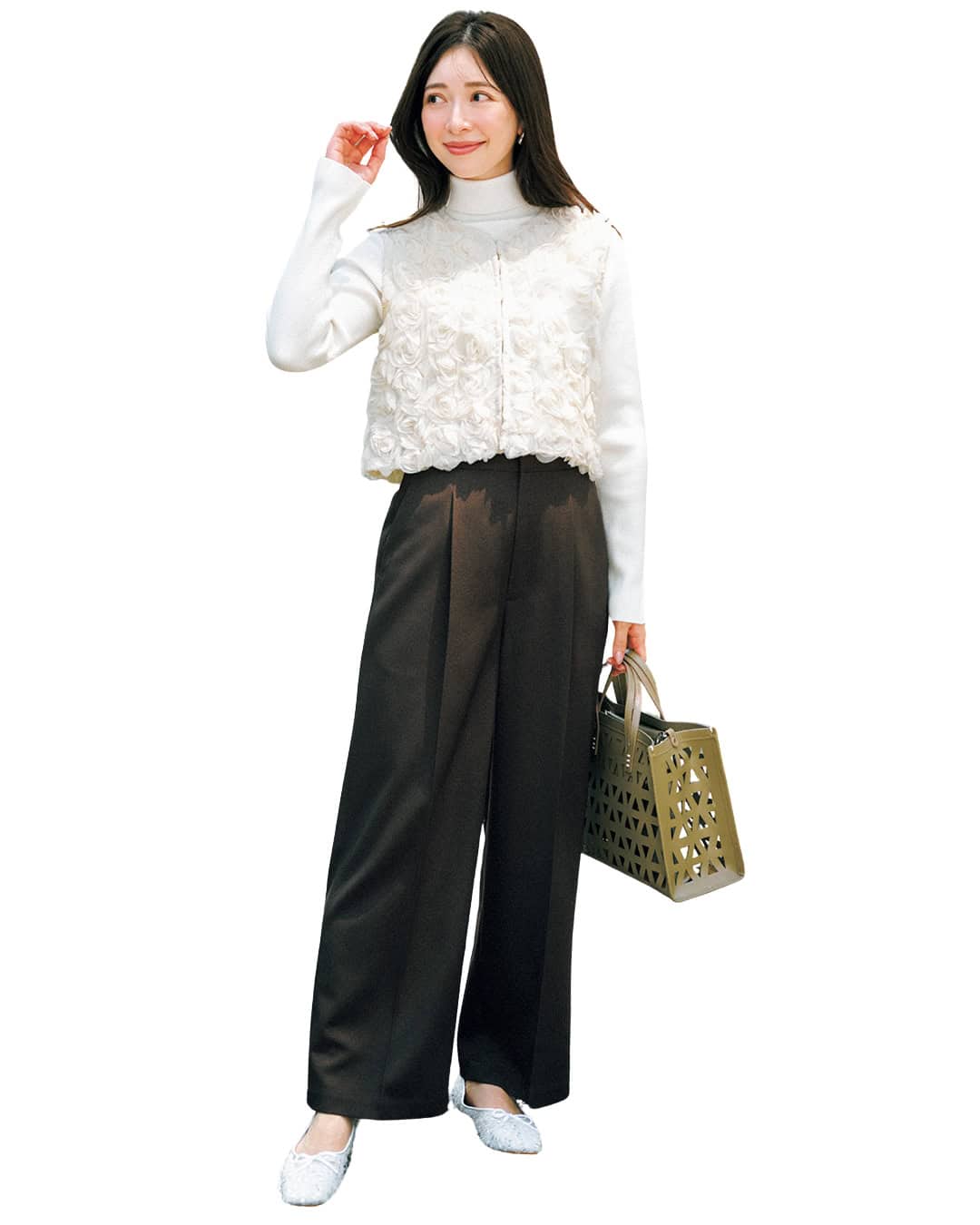 【写真3枚目】ジレは色違い。ニット¥10,780(カデュネ)パンツ¥22,000(アンクレイヴ/アンクレイヴ〈オンワード樫山〉)シューズ¥16,500(ダイアナ/ダイアナ 銀座本店)ピアス¥47,300(ウノアエレシルバーコレクション/ウノアエレ ジャパン)バッグ/スタイリスト私物