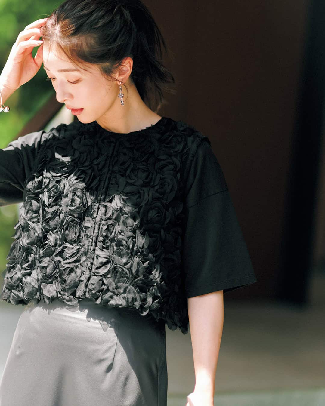 パッと目を引くチュールで象られた立体感のあるフラワー。甘いデザインでも重く見えないので、レイヤード次第で一年中着られるアイテムです。コンパクトな丈でスカートやパンツにも相性抜群。