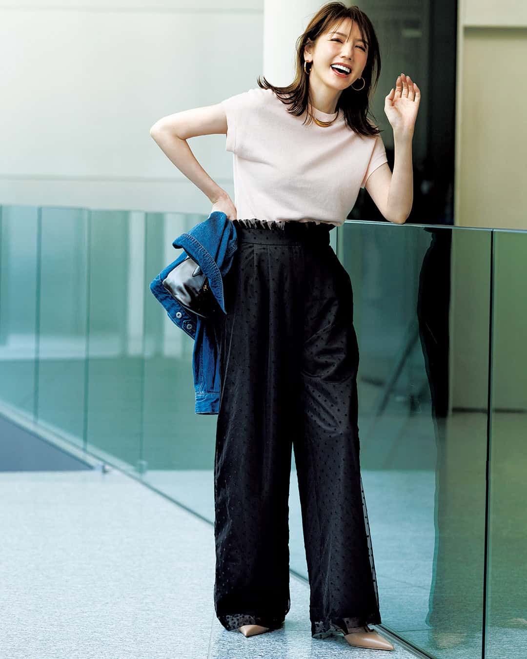 ドットチュールパンツ¥18,700(シークレット・トロフィー)カットソー¥13,200(ドレステリア/ドレステリア 渋谷スクランブルスクエア店)手に持ったデニムジャケット¥20,900(アルページュストーリー)バッグ¥71,500〈ミウウル〉パンプス¥38,500〈トニービアンコ〉(ともにデ・プレ)ピアス¥25,300〈SAFON〉ネックレス¥3,900〈soie〉(ともにロードス)