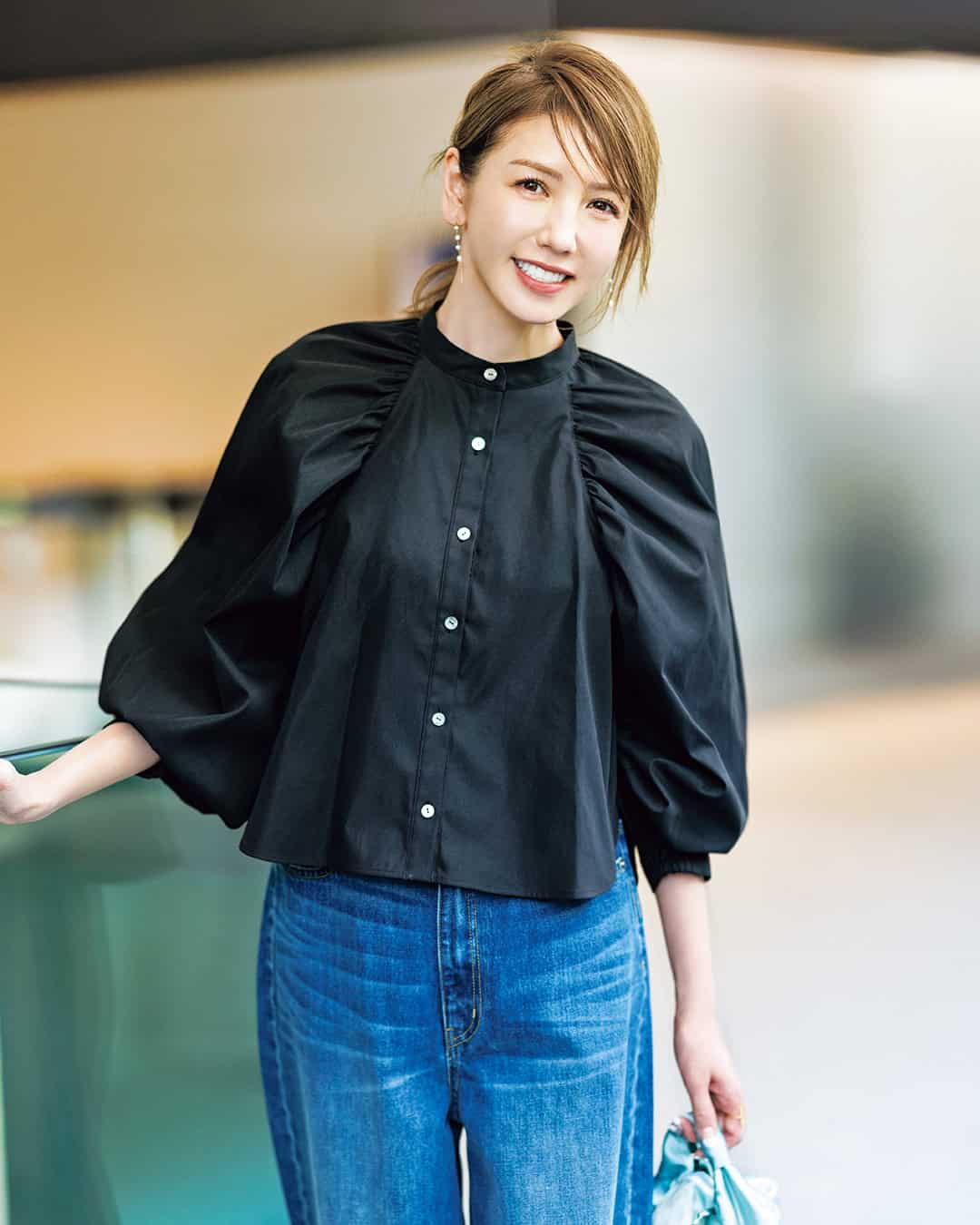 ボリュームスリーブブラウス¥16,500(シークレット・トロフィー)デニムパンツ¥20,900(アルページュストーリー)バッグ¥22,000(テンドレススタジオ/デ・プレ)イヤーカフ¥22,000〈ebiki〉リング[人さし指]¥209,000〈Elena Jewelry〉(ともにロードス)リング[薬指]¥21,600(アビステ)