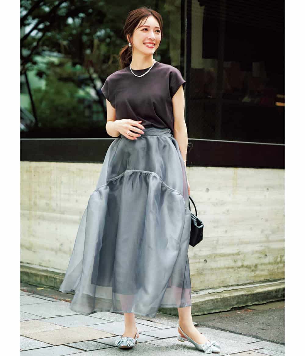 繊細なラメにふんわりとしたボリューム感が目を引くオーガンジースカート。特別感ある一枚は、Tシャツにニット、シャツと、どんなトップスもエレガントに格上げ。きちんと見えするのに、ウエストゴムでストレスフリーなのも嬉しい。