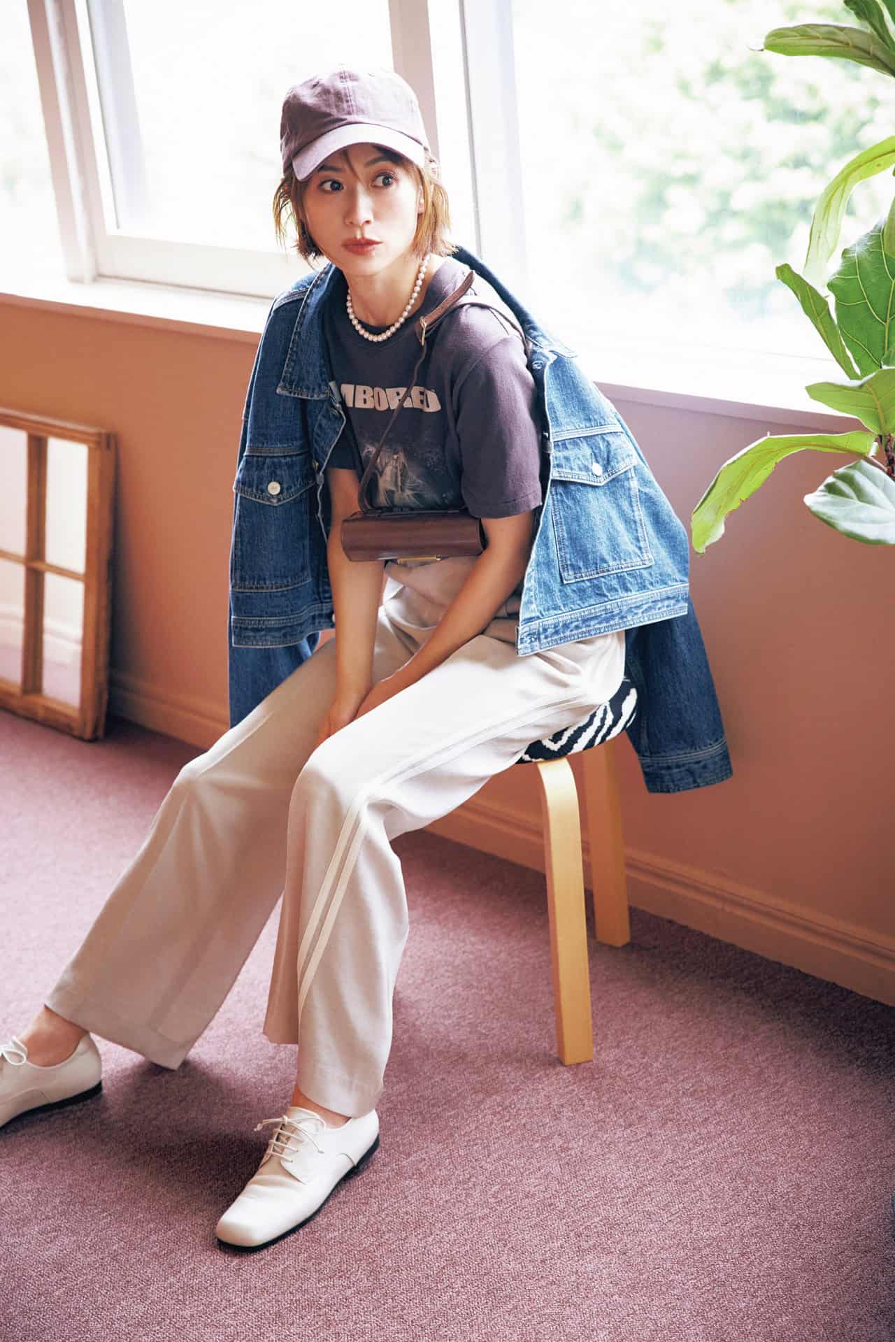 パンツ¥36,300(サードマガジン)デニムジャケット¥57,200(シー/エスストア)Tシャツ¥22,000(ゲミニー/ウィム ガゼット 玉川髙島屋S・C店)バッグ¥31,900(モフィオラ)シューズ¥79,200(ペリーコ/アマン)キャップ¥18,700(プロタゴニスタ/アマン)パールネックレス¥121,000(マユオカマツ/マユ ショールーム)