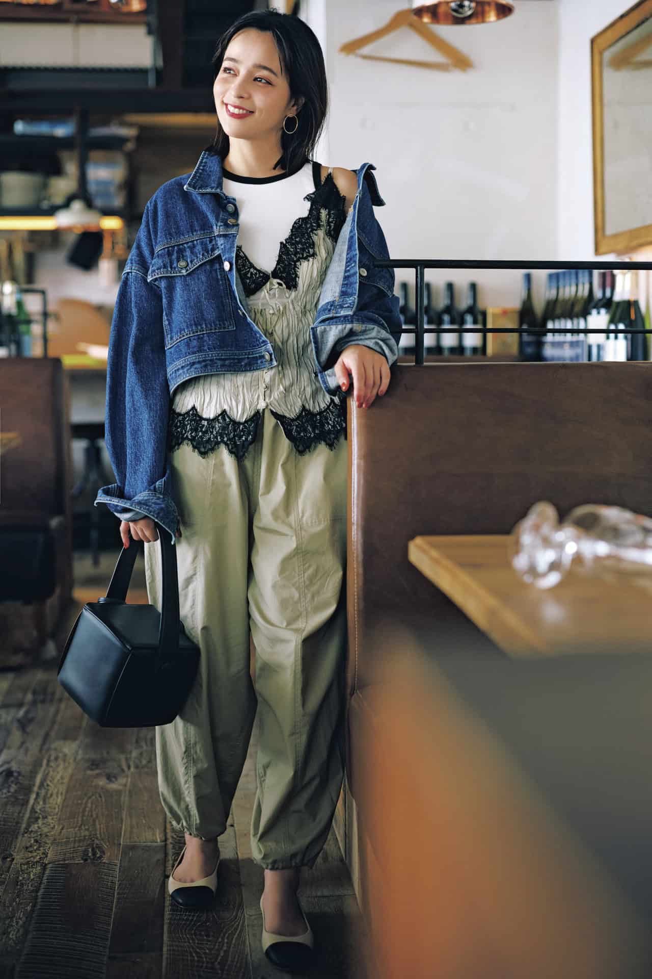 レースキャミソール¥20,900(プランクプロジェクト/プランクプロジェクト 青山店)デニムジャケット¥57200(シー/エスストア)タンクトップ¥12,000(トゥ)パンツ¥39,600(イレーヴ)バッグ¥82,500(メゾンヴァジック/ヴァジックジャパン)パンプス¥35,200(ファビオ ルスコーニ/伊勢丹新宿本店 本館2階 婦人靴)ピアス¥132,000※片耳価格(マユオカマツ/マユ ショールーム)