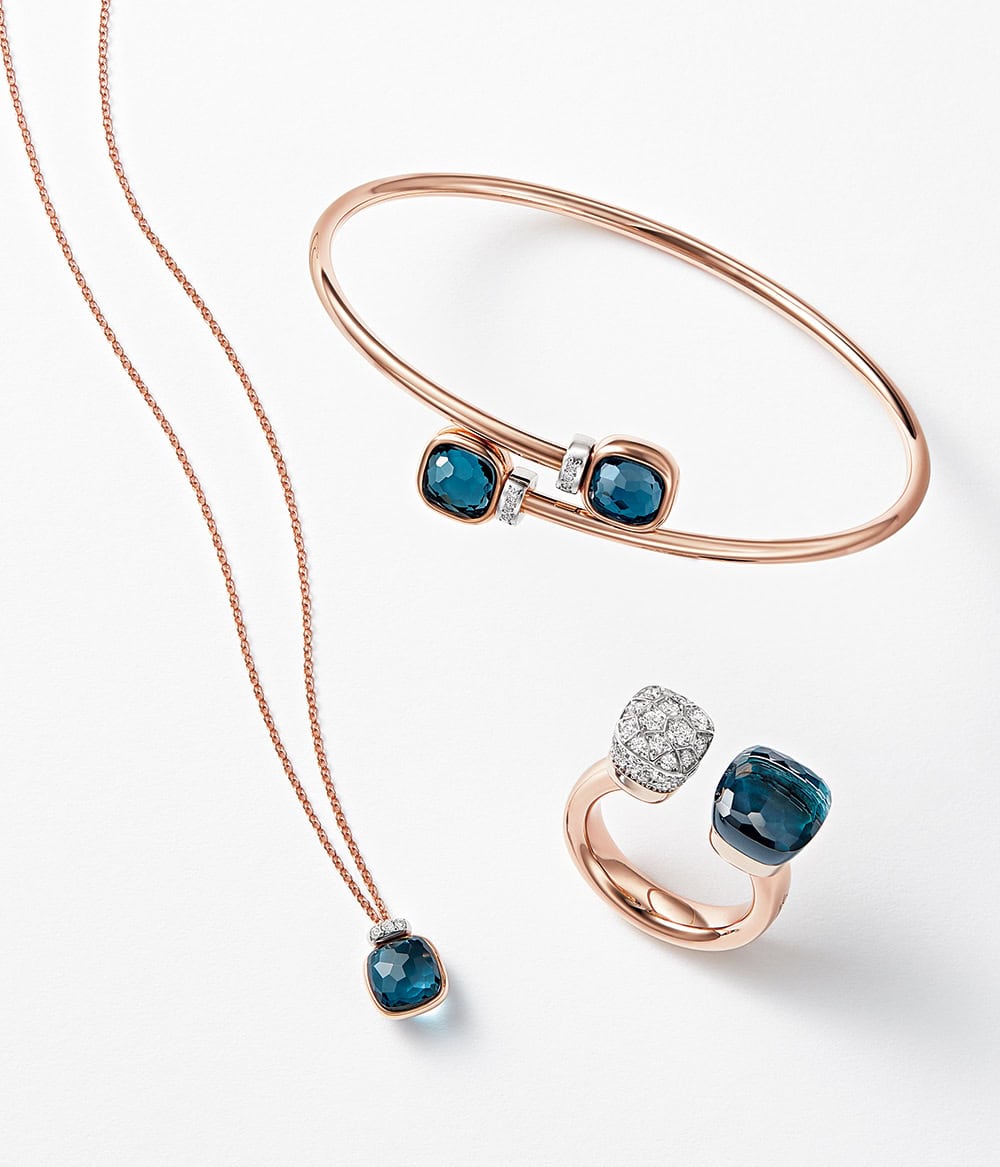 「ヌード ミニ」バングル〈RG×WG×ロンドンブルートパーズ×DIA〉¥814,000「ヌード」リング〈RG×WG×ロンドンブルートパーズ×DIA〉¥1,199,000「ヌード ミニ」ネックレス〈RG×WG×ロンドンブルートパーズ×DIA〉¥407,000(すべてポメラート/ポメラート クライアントサービス)