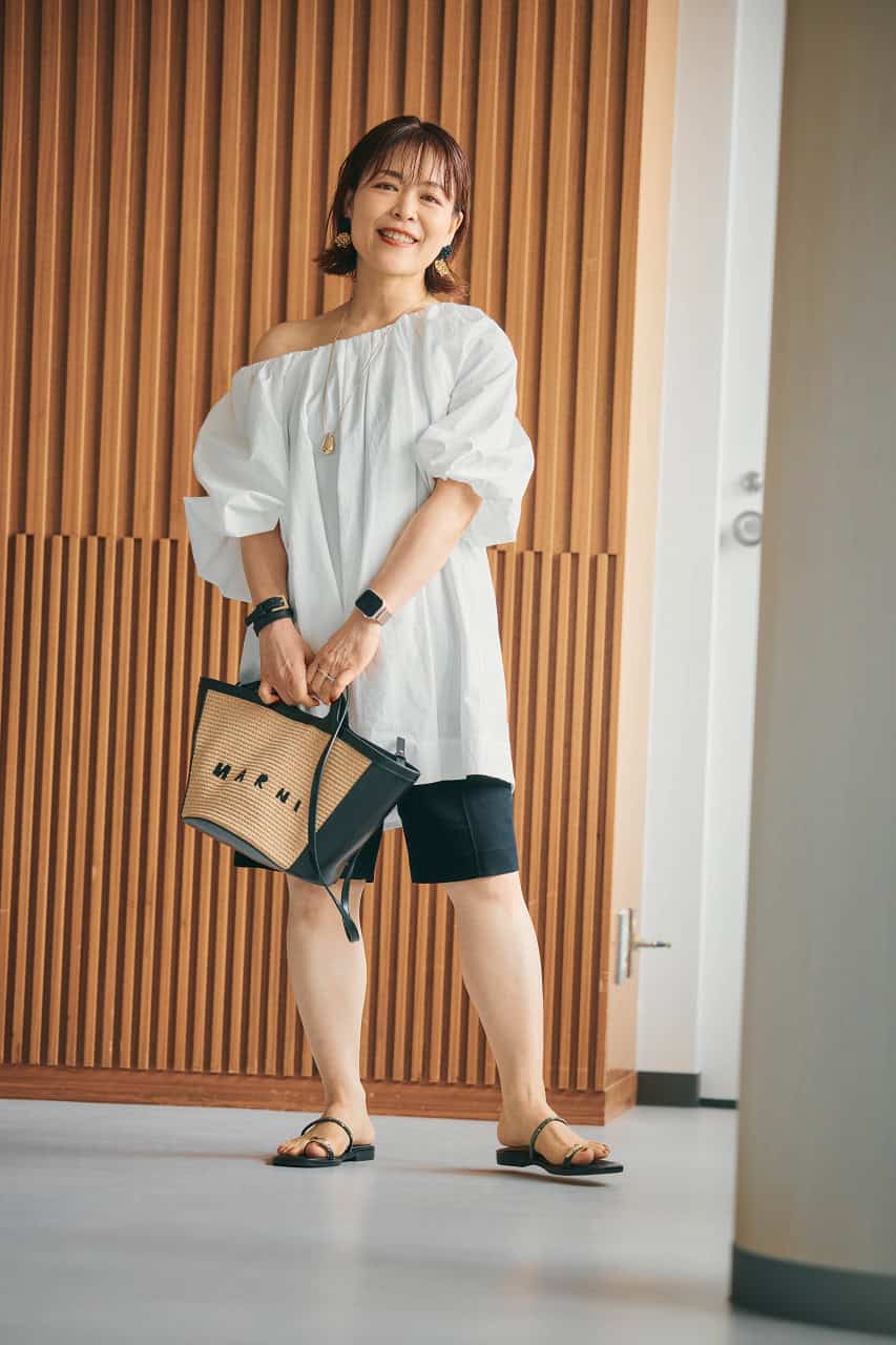 「149cmという身長的に、フルレングスよりもハーフやミニ丈ボトムスの方がバランスよくまとまるチュニックトップス。パーソナルスタイリストの同期たちとの代官山ランチには、旬のハーフパンツを合わせてトレンドも意識。全体をモノトーンでまとめることで、肌見せコーデもキレイめに」