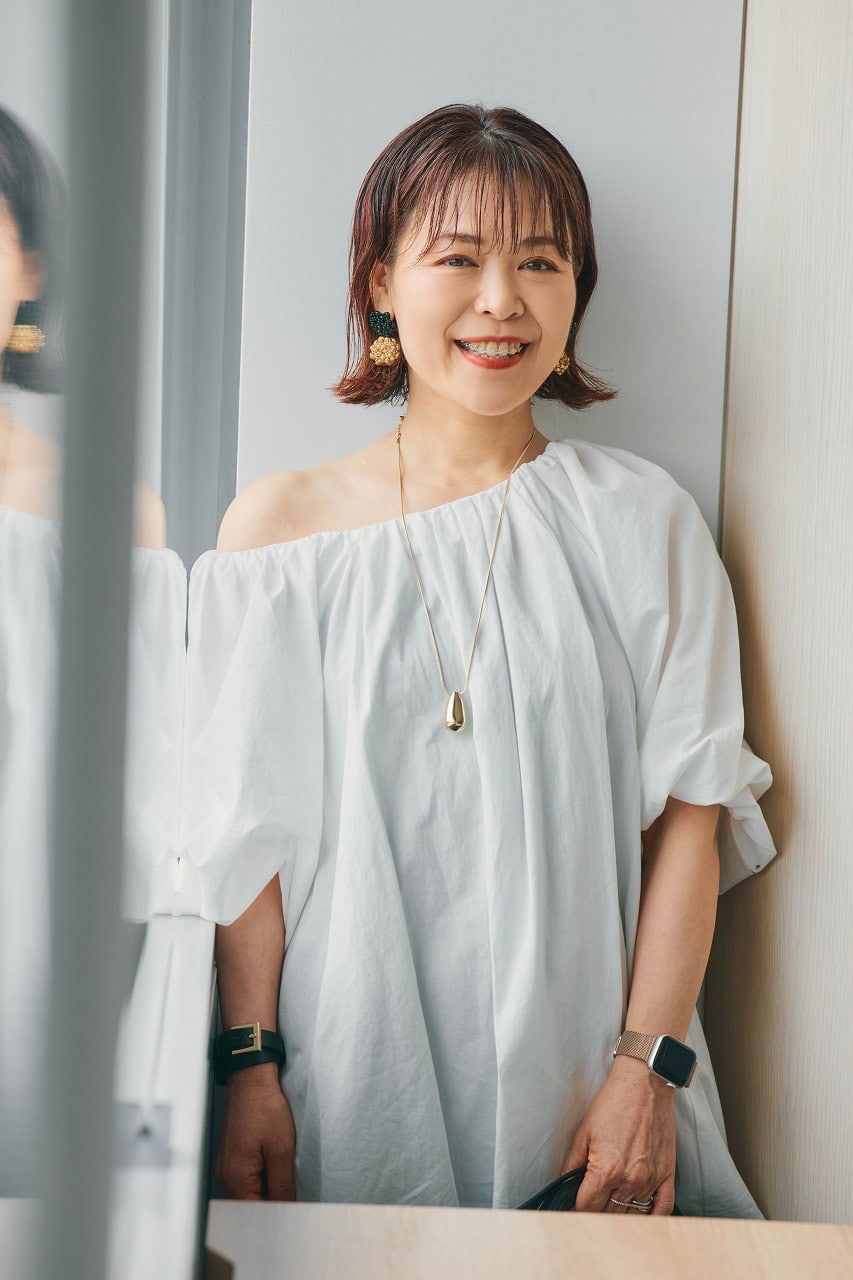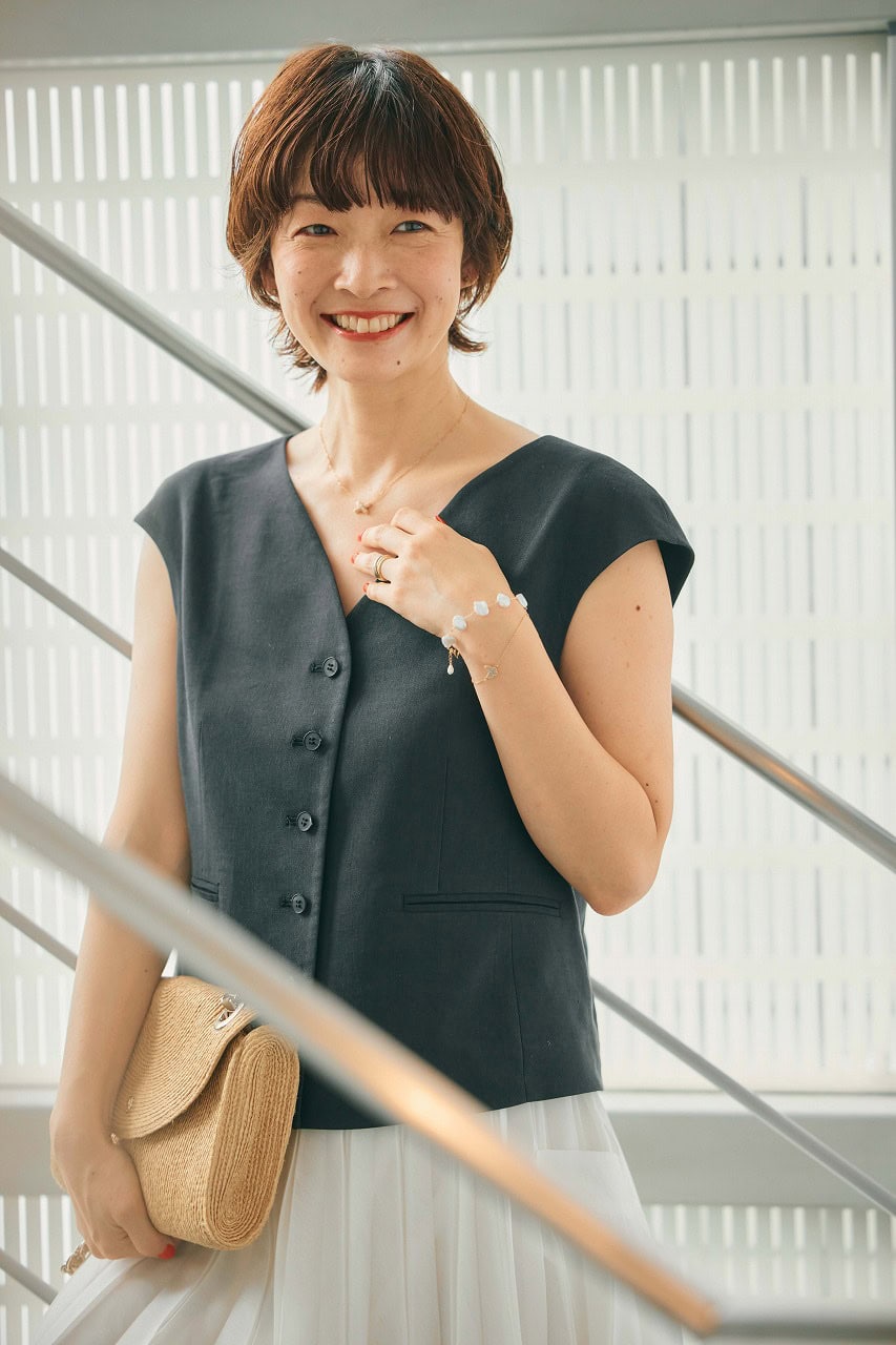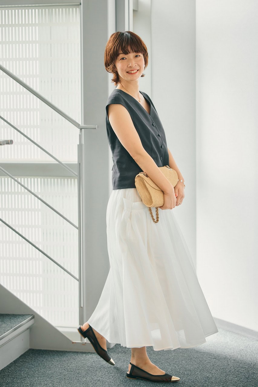 「パーソナルスタイリストの同期と定期的に開催しているプチ贅沢ランチ。食事を楽しみながら、普段のお互いの頑張りを褒めて讃え合う場面で意識したいのは、常に視界に入る上半身の着映え。骨格ウェーブにうれしいフレンチスリーブのジレを主役に、ふんわりスカートで甘さを、ゴールド小物で華やかさをMIX。大人の女性にちょうどいい、きれいめバランスに仕上げました」