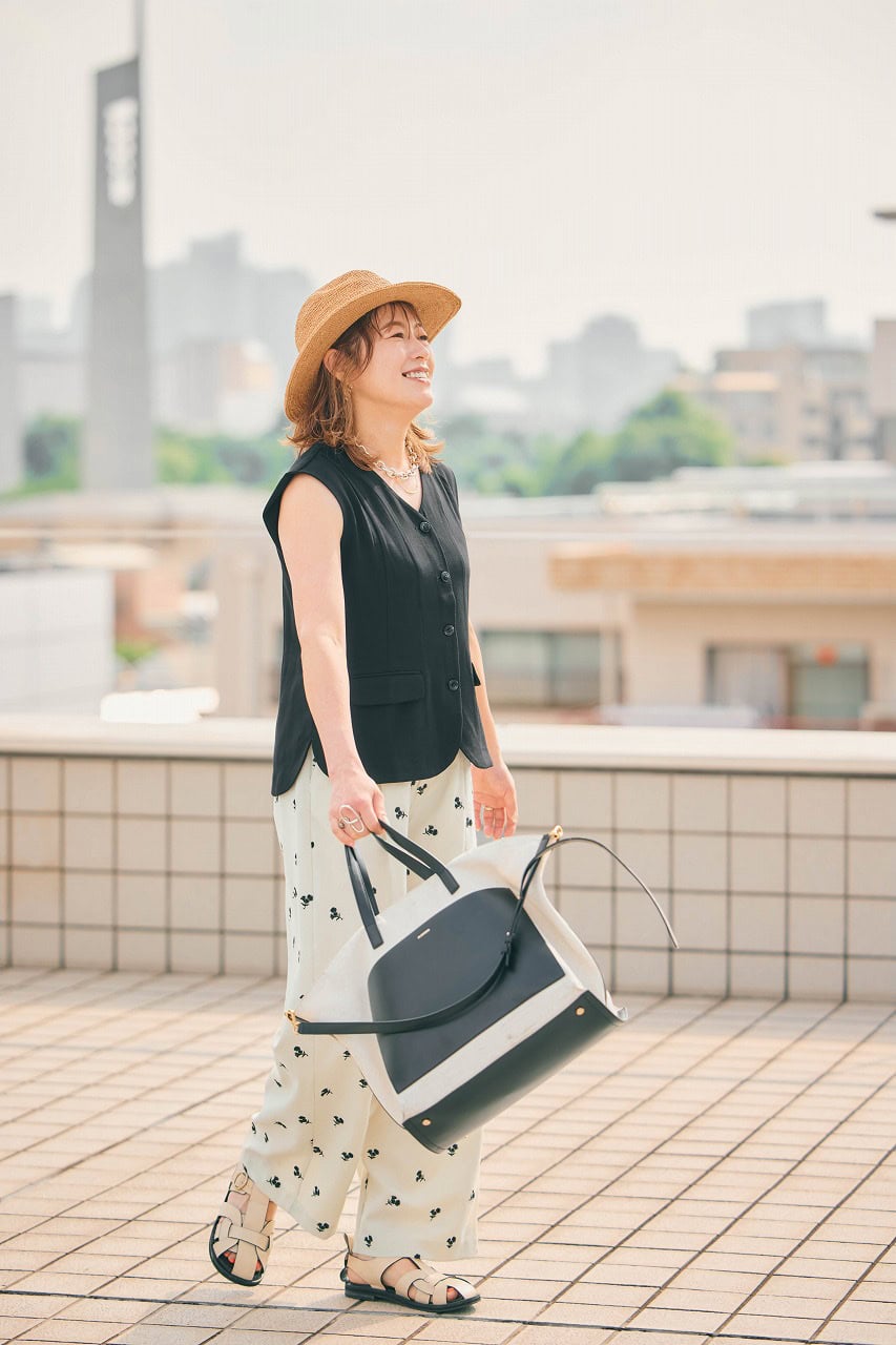 「ジレ+花柄パンツで、〝甘ニッシュ〟を体現。ハットもマニッシュ要素として活用。STORY認定パーソナルスタイリスト2期生の同期と、イベントに向けたランチミーティングの場では、思い切って二の腕を出してスッキリと。BON BON et CHOCOLATのジレは、上半身にメリハリがつくよう工夫されたシルエットで40代が頼れる1着です」