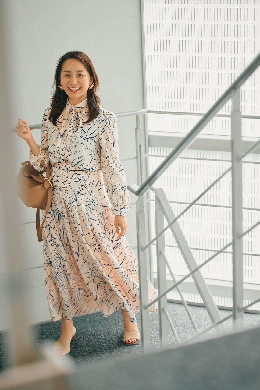 「同世代のママたちと集まるランチ会には、スケッチ風のボタニカルプリントが印象的なセットアップを。ボウタイでしっかり感を出しながら、繊細なタッチの柄&シルクのようなしなやかな素材で女性らしさも演出。軽やかに揺れるスカートのシルエットも、華やぎアップに一役買ってくれます」