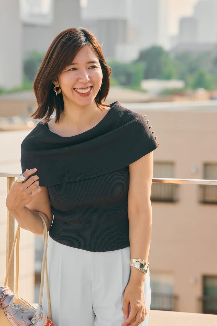 「オシャレ感度の高い同世代女子と、好きなファッションを自由に纏って集まる会では、非日常感も演出したいので、オフショルで少し冒険コーデに。オフショルは、大人女性も無理なく取り入れやすいブラウンをセレクト。ユニクロのタック入りワイドパンツは、丈長めを選び、自分好みのレングスにカットして調整。横長シルエットのバッグで〝今〟のムードも盛り込みました」