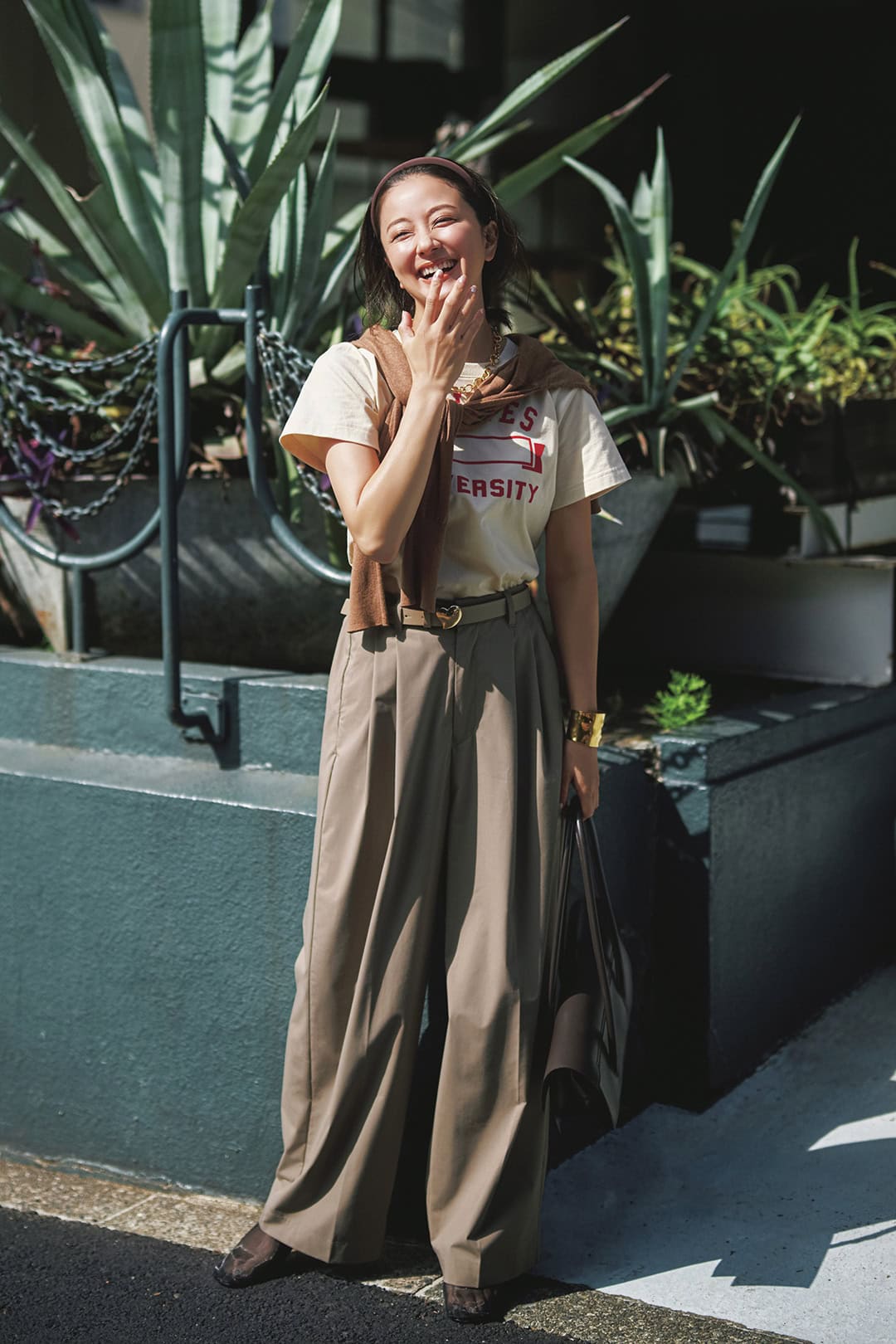ロゴTシャツ¥16,500(アンスクリア/アマン)肩掛けにしたニットカーディガン¥25,300(ウィム ガゼット/ウィム ガゼット 玉川髙島屋S・C店)パンツ¥27,500(スリードッツ/スリードッツ 表参道店)ベルト¥13,200(レフィエ/フラッパーズ)バッグ¥44,000(モフィオラ/アマン)サンダル¥44,000(ダブルスタンダード クロージング/フィルム)カチューシャ¥26,400(アレク サンドル ドゥ パリ/アレクサンドル ドゥ パリ GINZA SIX店)ネックレス¥35,200(ローラ ロンバルディ/八木通商)バングル¥61,600(ソコ/ZUTTOHOLIC)