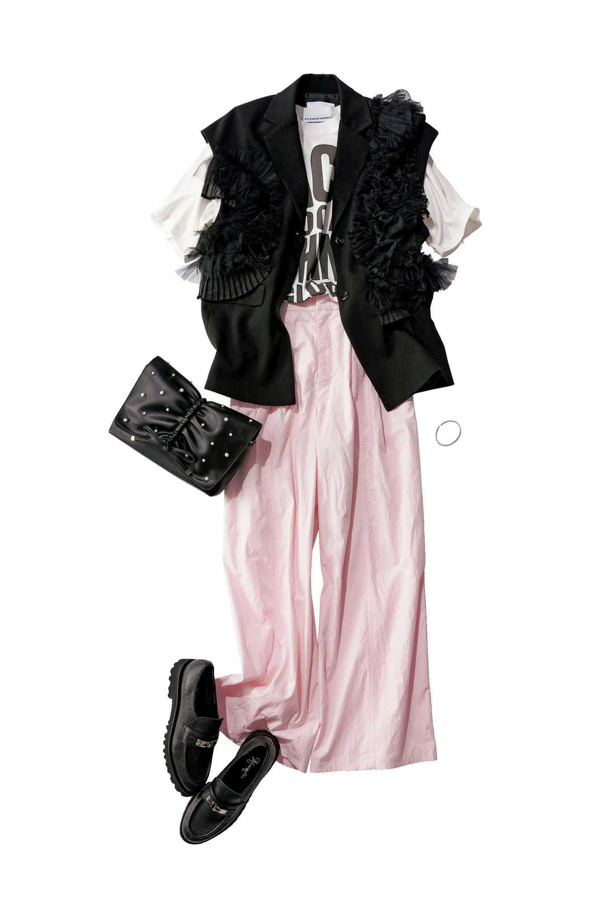 ジレ¥27,500(ラベルエチュード)ロゴTシャツ¥15,400(サードマガジン×キャサリン・ハムネット/THIRD MAGAZINE)パンツ¥11,000(アパートバイ/アダストリア)バッグ¥14,850(ダイアナ/ダイアナ 銀座本店)ローファー¥35,200(銀座かねまつ/銀座かねまつ6丁目本店)バングル¥33,000(ウノアエレシルバーコレクション/ウノアエレ ジャパン)