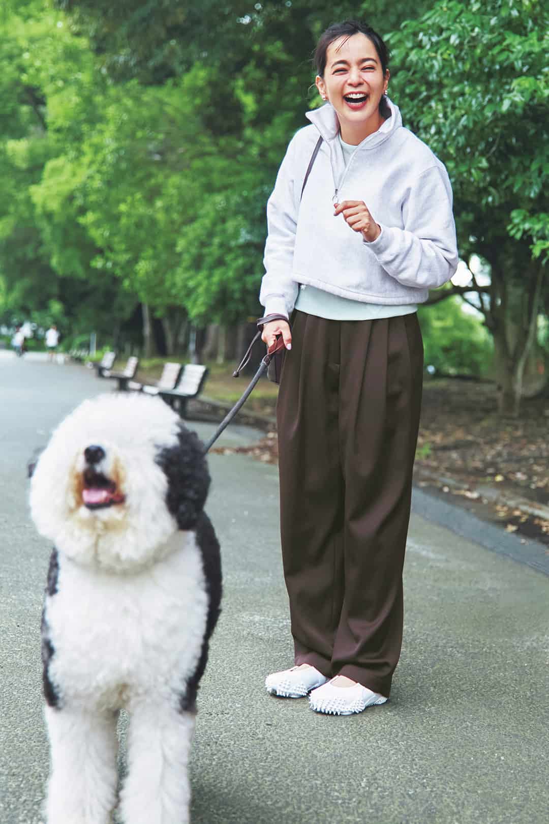 タイトスカートもパンツも、どんなボトムスとも相性がいいのも大きな魅力。スポーティなアイテムたちだけれど、上品な印象に。
