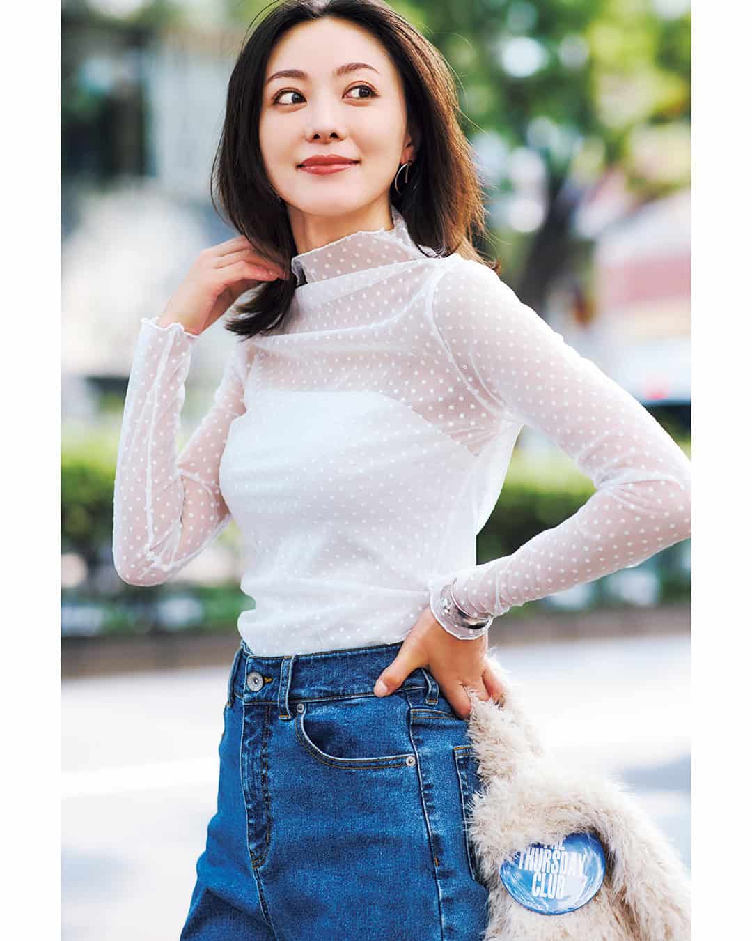 ⑦「チュールシャツ」1枚あれば華やかコーデが完成!