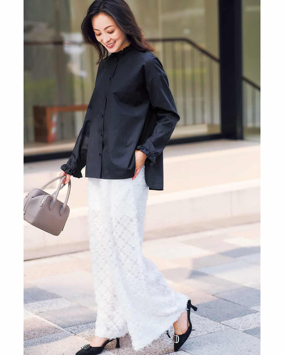シャツ¥17,600(トラッツォドンナ)パンツ¥25,000(シーニュ)シューズ¥9,900(ランダ)バッグ/スタイリスト私物