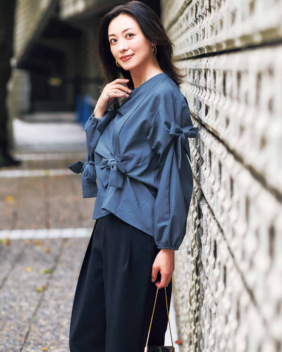 トップス¥11,900(AMOMMA)パンツ¥33,000(ツル バイ マリコ オイカワ)バッグ¥7,260(ル タロン/ル タロン 有楽町マルイ店)ピアス¥3,780(アビステ)バングル¥83,600(ニナ・エ・ジュール/ショールーム ロイト)インナー/スタイリスト私物