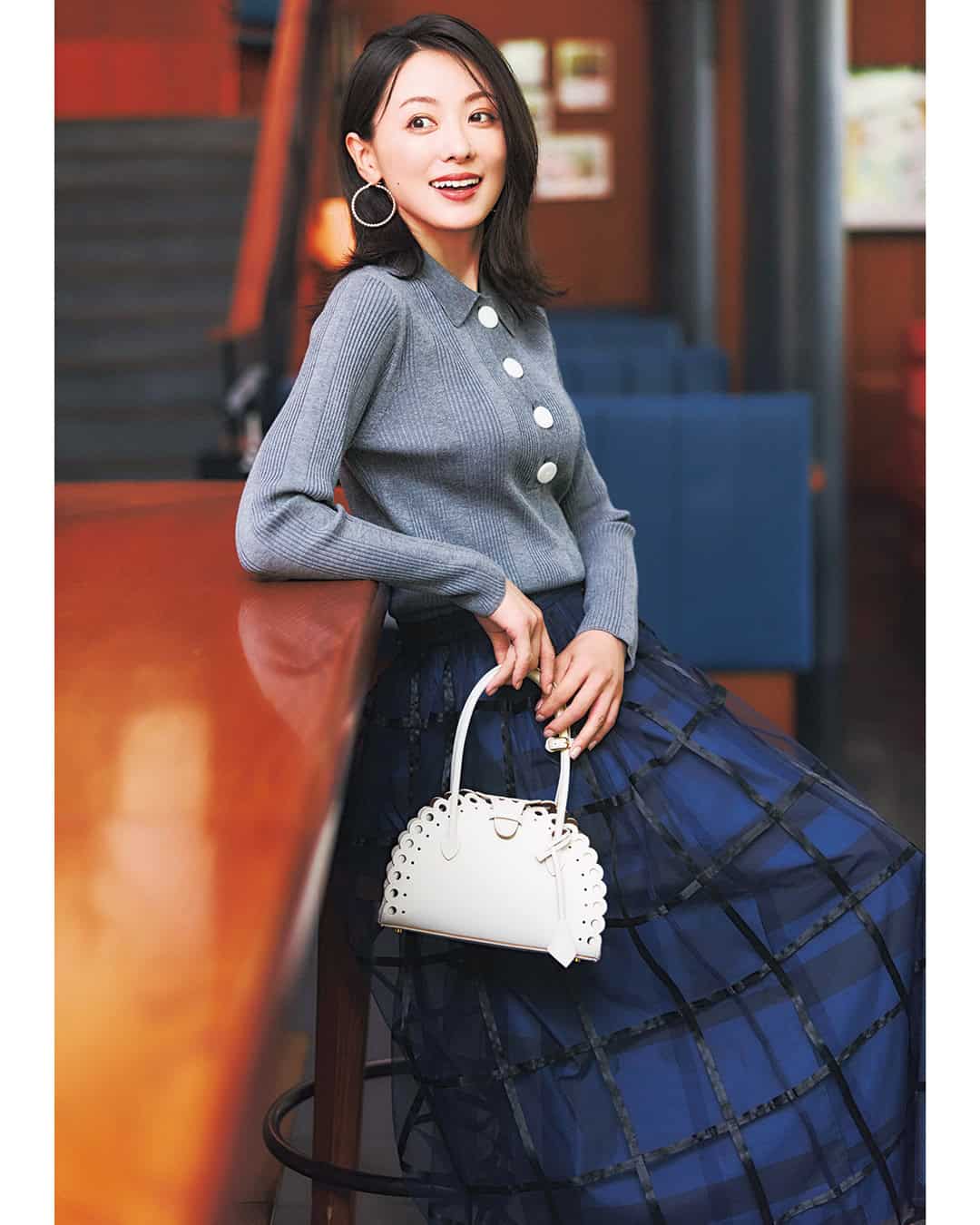 【写真1枚目】スカート¥29,700(ヌキテパ/パサンド バイ ヌキテパ)ニット¥8,990(アンフィーロ/アンフィーロ〈オンワード樫山〉)バッグ¥16,500シューズ¥29,700(ともにダイアナ/ダイアナ 銀座本店)ピアス¥12,100(カラ・ユ/ショールーム ロイト)リング¥21,450(ココシュニック オンキッチュ/ココシュニック)
