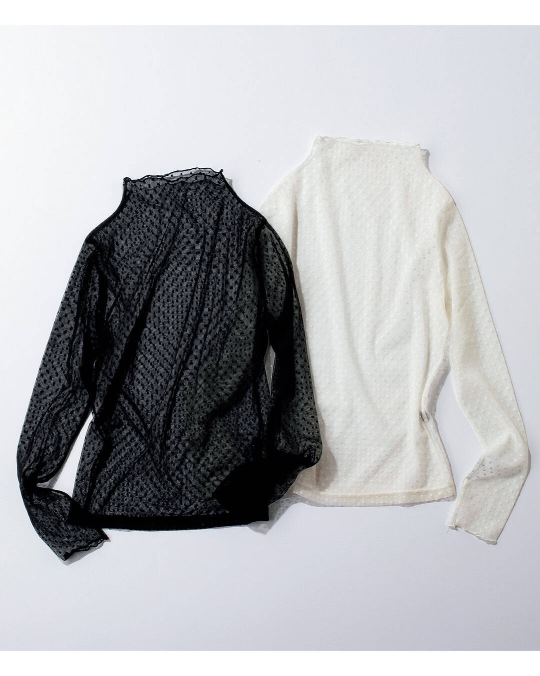 袖にミニドット柄のチュールを重ねたニットは、やりすぎていない甘さが大人に丁度いい。モックネックとコンパクトなボディが上品でコーデを高見えへと導きます。