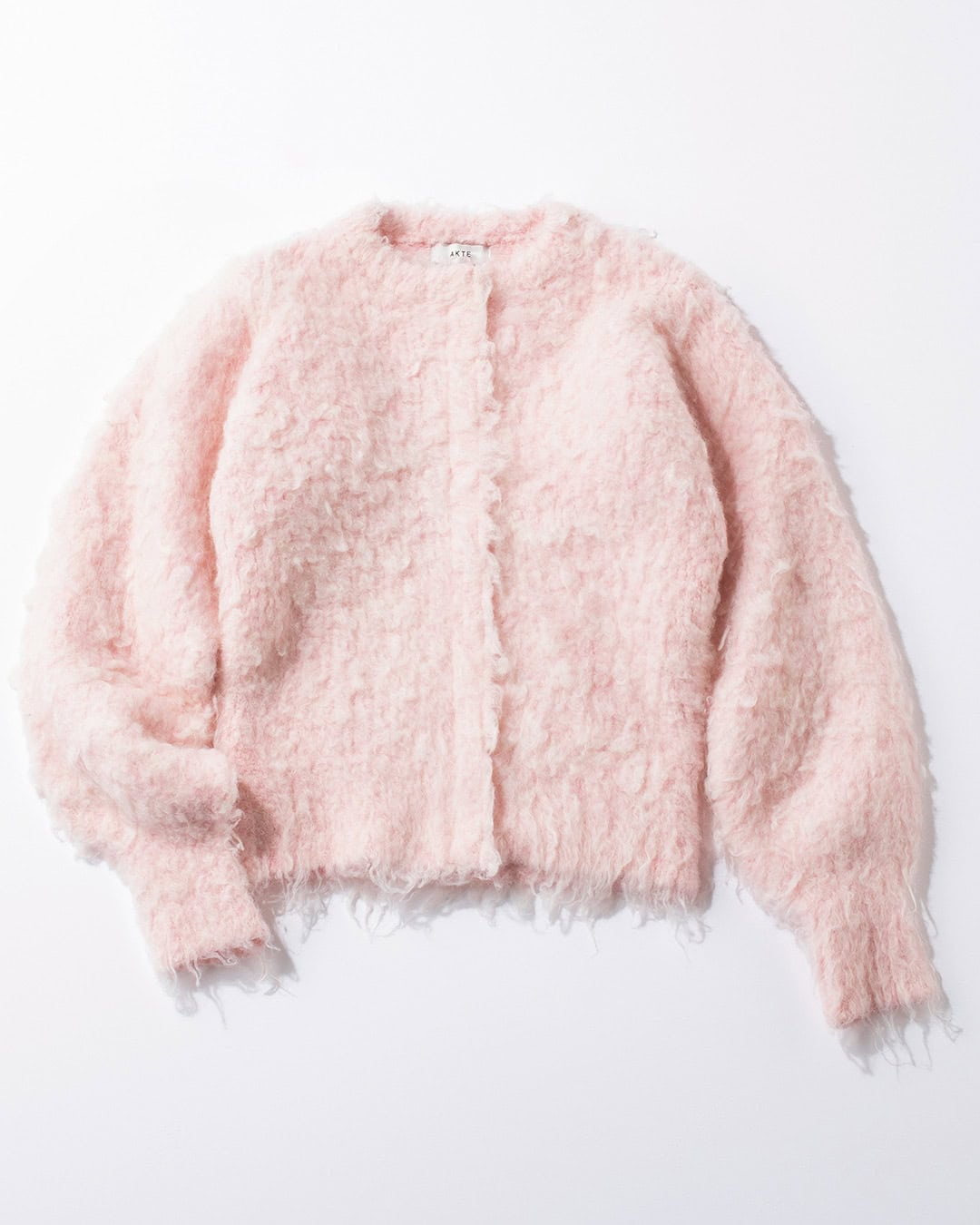 シャギーの質感と淡いピンク色に心ときめくカーディガン。コンパクトながら短すぎない丈でスカートともパンツとも相性抜群。比翼のデザインは、留めるとプルオーバーのように着られます。