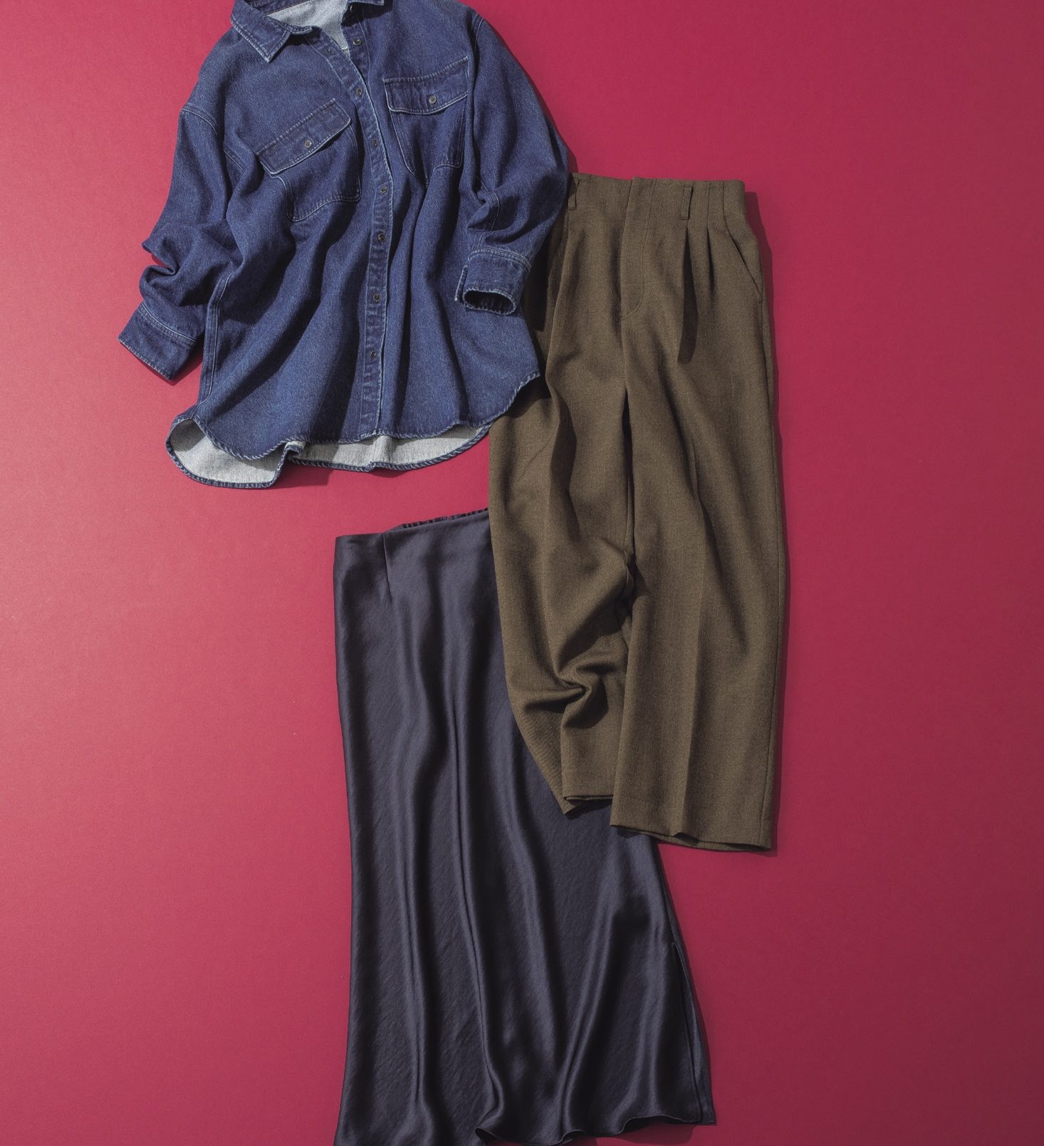 A 着脱が楽で朝夕の寒暖差にも対応できるシャツは通年通して重宝。¥9,900(ミーリー) B この秋冬トレンドのブラウンカラーはパンツで取り入れて旬のコーデを。¥16,500(SHIPS) C スニーカー、パンプス、ブーツなどどんな靴ともバランスがとりやすいサテンスカート。スカート¥18,700(イエナ)