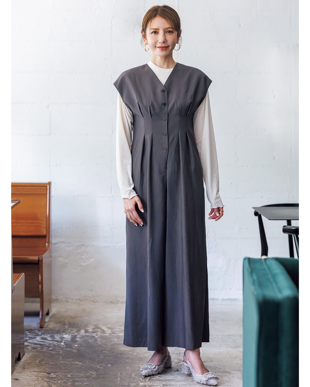 インナーに重ねても、1枚で着ても美シルエットのオールインワン。リボンでウエストマークすることで脚長効果が期待できます。さらにウエストに配したタックが間伸びした感じを防いで、立体的なシルエットに見せてくれます。これも自宅で手洗いが可能なので、日々愛用できます。
