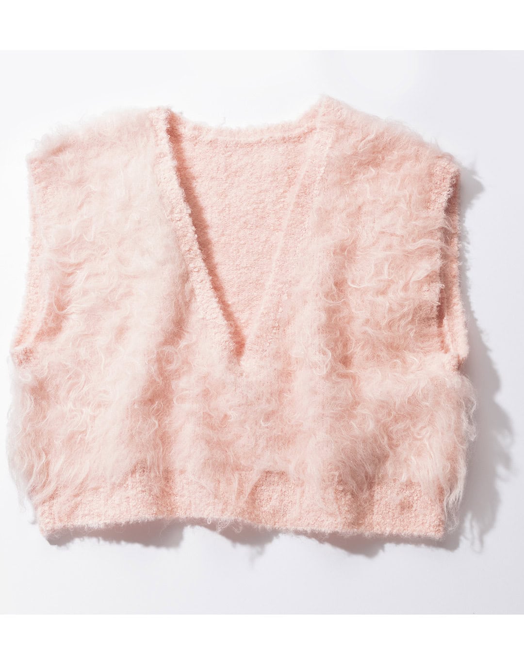 起毛加工をしたふわふわとした素材感が可愛いニットベストは、今年らしさを出すためにショートめの丈感にしたので、ボトムスとコーディネートしたときに脚長に見せてくれます。深めに開いたVネックも女らしいデザイン。リサイクルポリエステルを使用したサスティナブル素材を使っています。