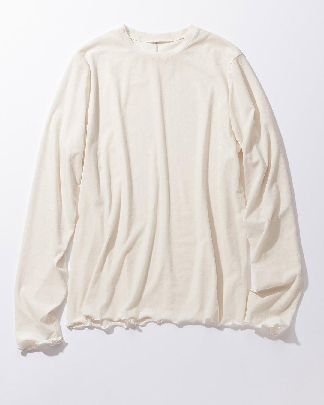 シアータイプのベロアを使ったトップスは写真のように2枚重ねて着ても可愛いし、隣のページのようにベストやニット下にも重宝します。袖口にステッチをかけてフリルのような甘いテイストをプラスしています。2枚レイヤーしてもかさ張ることのない素材感も使いやすい!