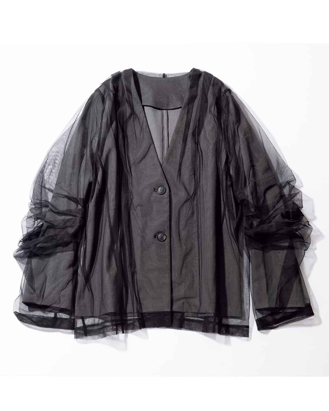 スーツ素材にチュールをレイヤードしたジャケットはオシャレ感度の高いアイテム。これ1枚羽織れば今見えは完璧です。袖の部分や肩にタックを寄せてチュールが際立つように仕上げています。ジャケットでも自宅でのお手入れが可能です。今シーズン一押しのノーカラージャケットです。