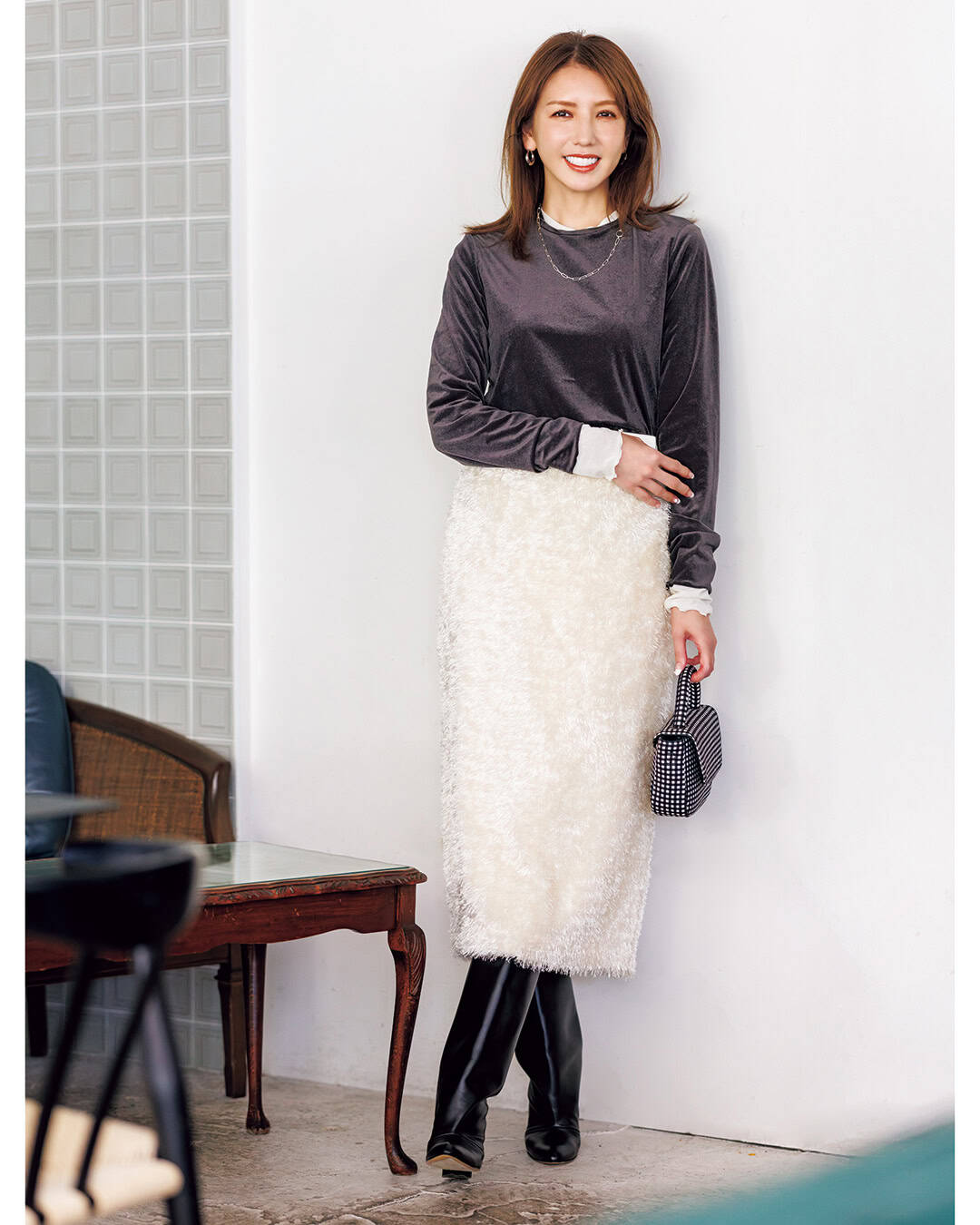 シアーベロアプルオーバー(チャコールグレー)¥13,200シアーベロアプルオーバー(ホワイト)¥13,200(ともにシークレット・トロフィー)スカート¥24,200(アンタイトル)バッグ¥18,700(ツル バイ マリコ オイカワ)ブーツ¥110,000(ネブローニ)ピアス¥3,300(デイジールイス/ロードス)ネックレス¥17,600(ココシュニック オンキッチュ/ココシュニック)