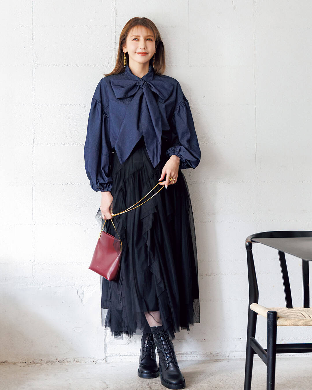 リボンデニムブラウス¥18,700(シークレット・トロフィー)スカート¥24,200(アルページュストーリー)バッグ¥69,300(マエストソ/オブリオ)ブーツ¥60,500(ツル バイマリコ オイカワ)ピアス¥7,700〈MU〉リング[左手人さし指・中指]¥3,520〈ヘンカ〉リ