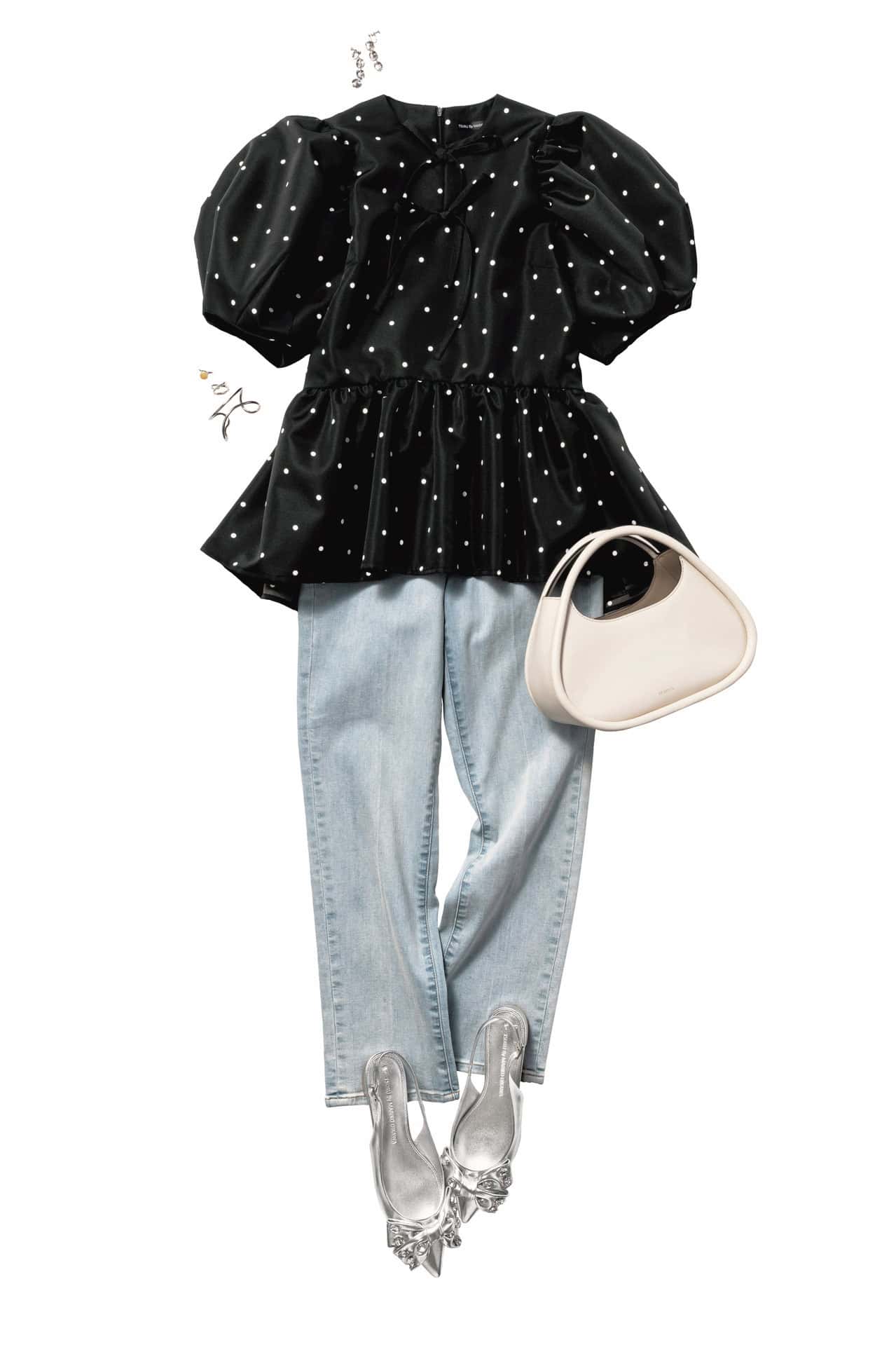 優しげな明るめカラーのデニムのパンツは、モード感のあるシルバーのパンプスとの組み合わせがバランス良し。大ぶりのリボンで足元にボリュームをもたせることで、脚がすっきり見えます。存在感強めな黒トップスを合わせて、甘辛く仕上げるのが大人の正解。