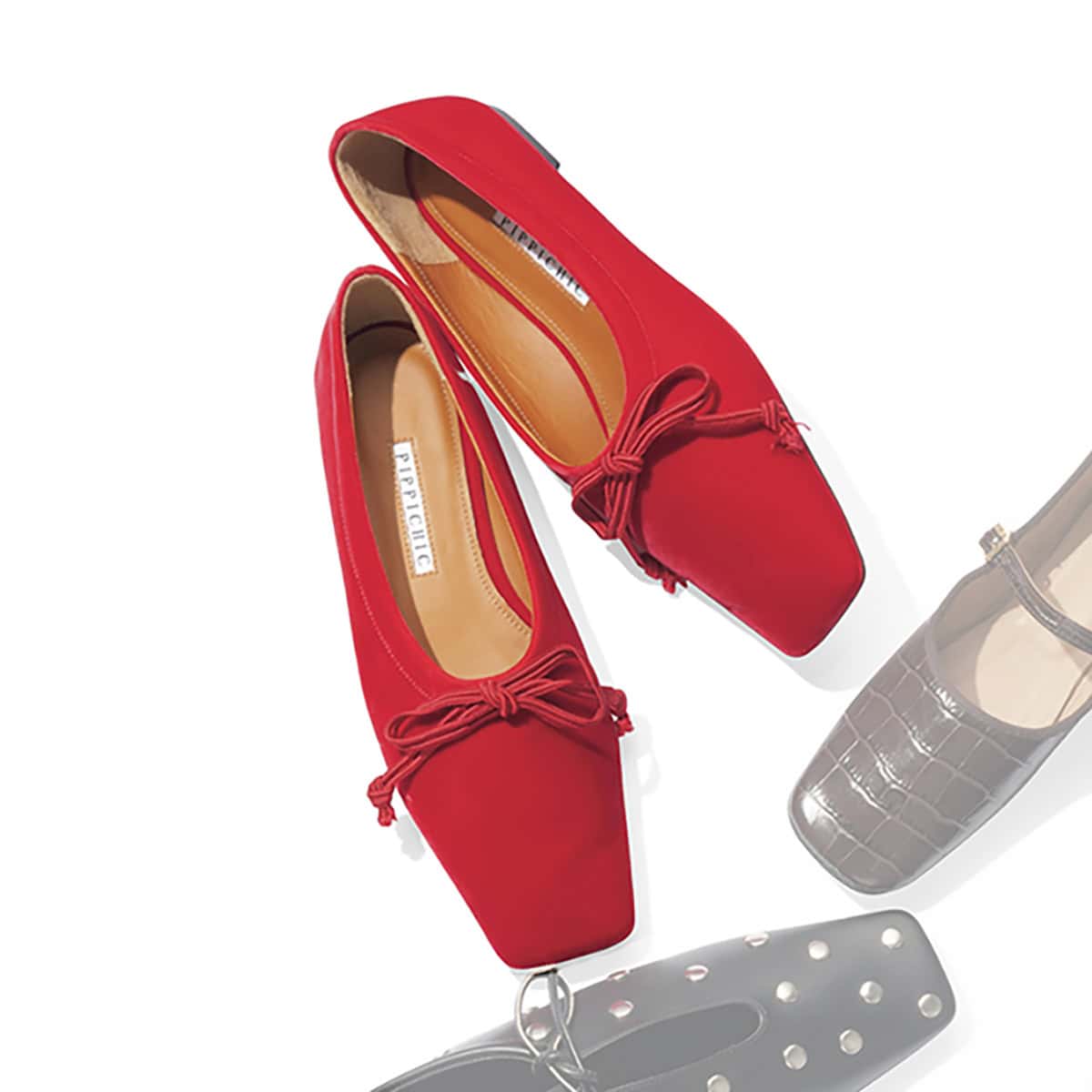 バレエシューズはトウが四角くなることでスタイリッシュな印象に。赤パンプス¥37,400(ピッピシック/ベイジュ)