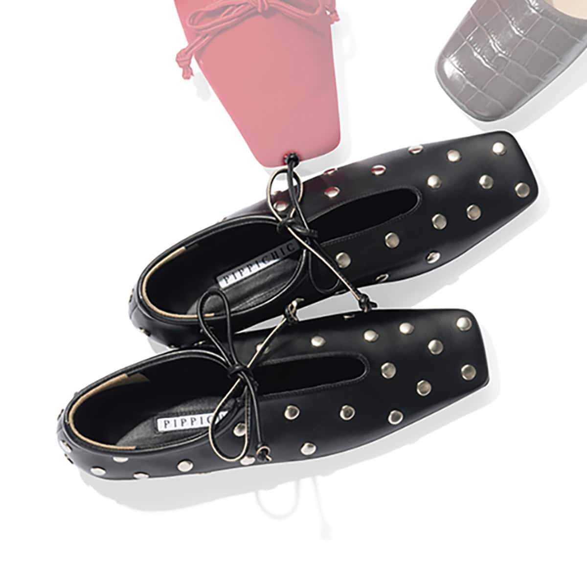 エッジィなスタッズと華奢なリボンがアクセント。スタッズパンプス¥42,900(ともにピッピシック/ベイジュ)