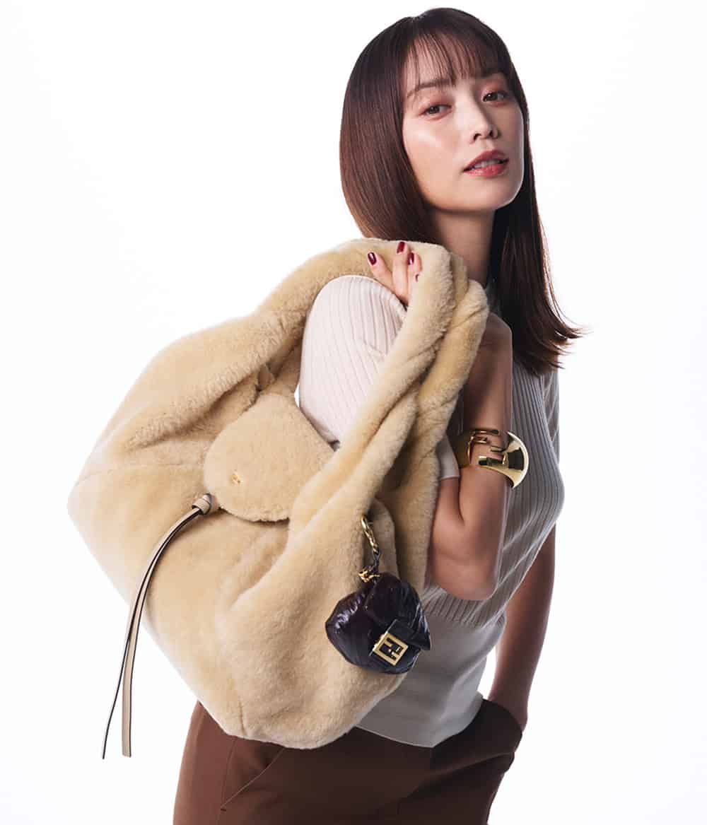 「温もりと癒しをくれるFENDIらしいシアリング。まだ暑さの続くTシャツの日も小物から秋らしいニュアンスをプラス、秋の到来とともにお迎えしたい。あえてインパクトのあるラージサイズをチョイス」(モデル・蛯原さん)