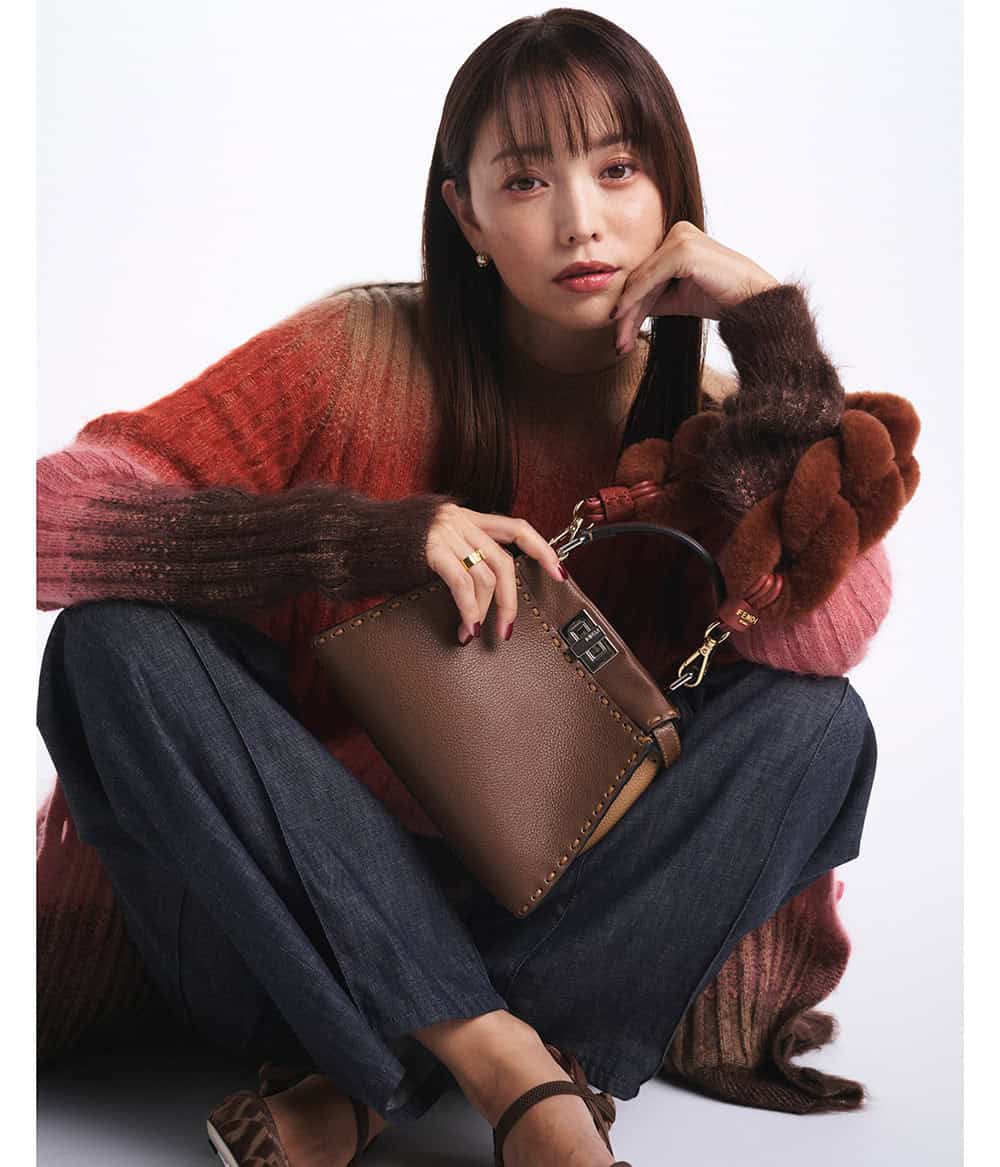 「最近、同じピーカブーが仲間入りしたばかり!チョコレートとキャラメルのような、こっくりとしたカラーリングが、秋の装いを盛り上げます。キャッチ―なストラップでカスタマイズ、遊び心を」(モデル・蛯原さん)