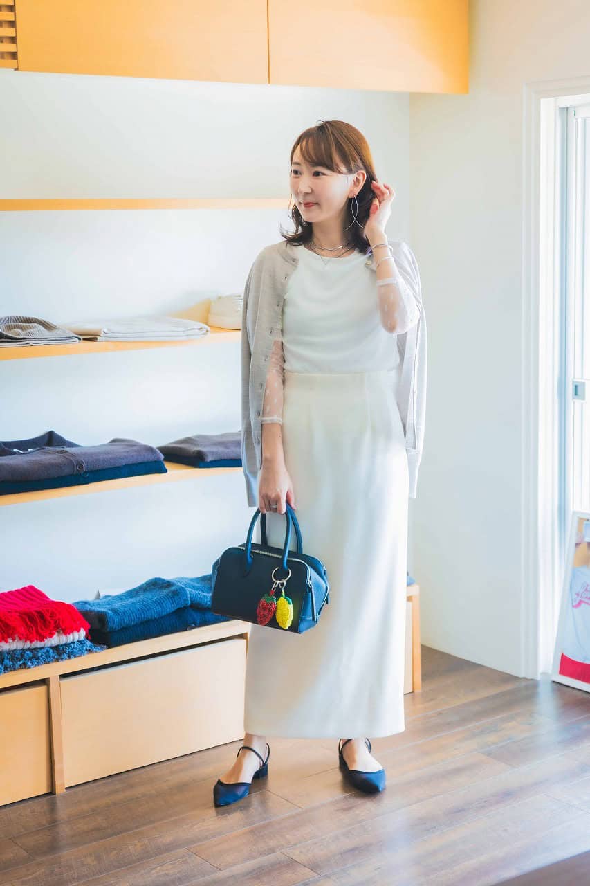 「羽織りとしても万能なカーディガンですが、1枚で着こなすのもおすすめ!カジュアルなホワイトデニムと合わせても、グレーならきちんと感をキープできます。ホワイトデニムと同色の白とシルバーの小物で統一感を出し、爽やかで洗練された雰囲気に。さらにウエストをベルトマークし、ロングネックレスを添えて、大人の余裕を感じさせる華やかカジュアルスタイルに仕上げました。」