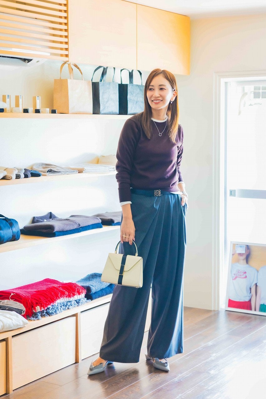 「織り目が細かく光沢感が上品で高見えするブラウンセーターは、旬色で気持ちも上がります。シンプルなワン・ツーコーデが華やぐように、白インナーをレイヤードして抜け感を演出。モードにキマるストライプ柄のドレープパンツと合わせ、マニッシュな雰囲気にまとめました。シンプルなアイテムだからこそ、ベルトでウエストマークすることでシルエットにメリハリを出したのもポイントです。」
