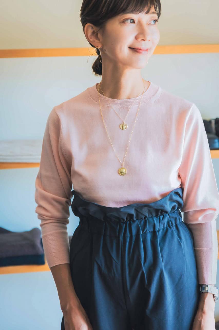 「カラー展開の豊富な無印のセーターシリーズから、今季は顔映りを明るく見せてくれるピンクをセレクト。コンパクトなシルエットは、ハイウエストのボトムスとも好相性でスタイルアップが叶います。シンプルなデザインだからこそ、ジュエリーや個性派バッグなど小物で遊び心をプラスし、派手になり過ぎない40代のモードスタイルに。」
