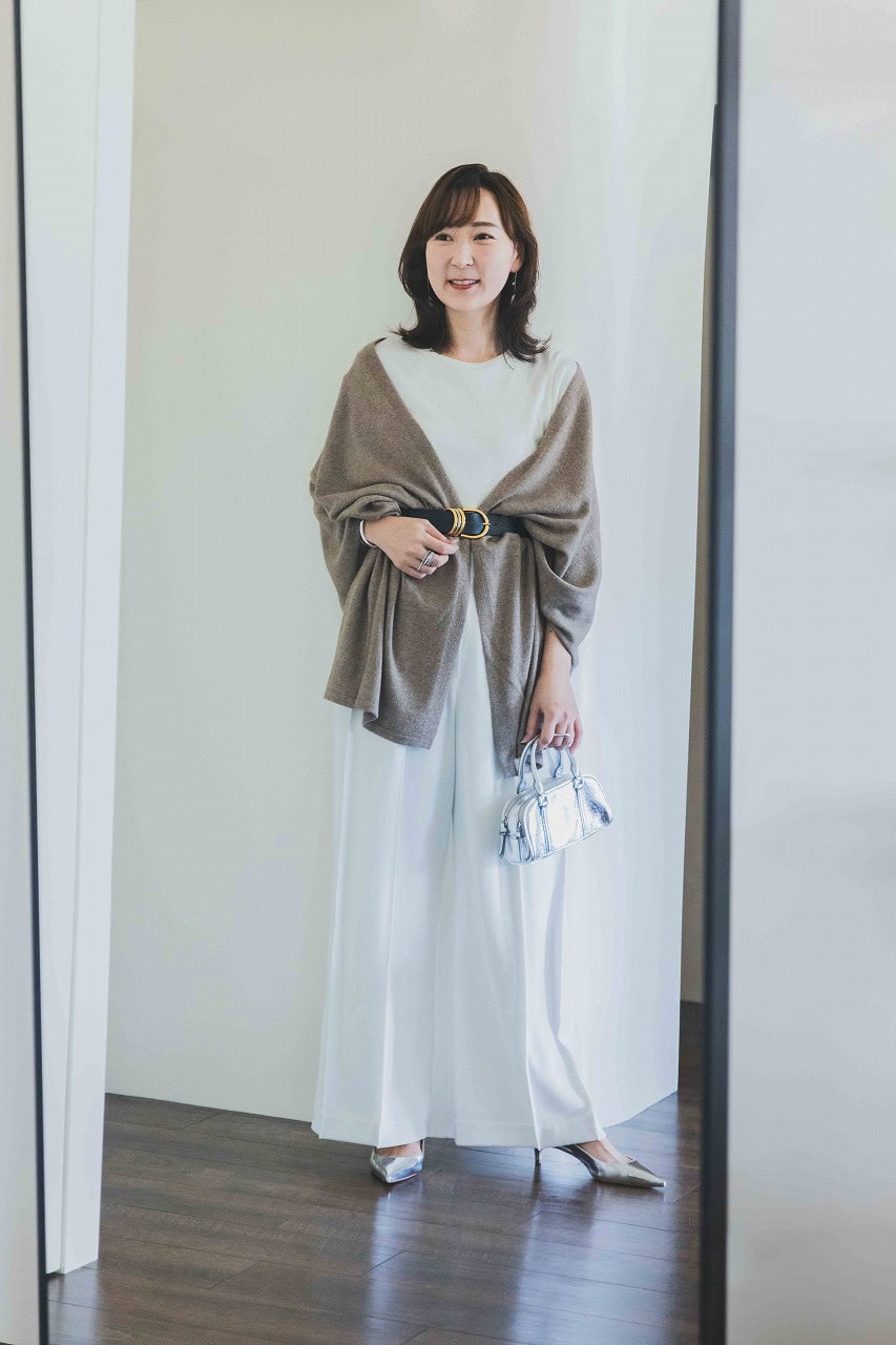 「上質なカシミヤのストールは軽やかで柔らかな肌触りが魅力。肩から羽織ったりベルトでウエストマークしてカーディガン風に着たりと、着回し力抜群なので一枚あると重宝します。ニュアンスのあるブラウンはホワイトのワントーンに奥行きを加え、シルバーの小物をアクセントに添えれば、上品さの中にモード感も。防寒にとどまらず、秋の装いを格上げする主役級アイテムです。」