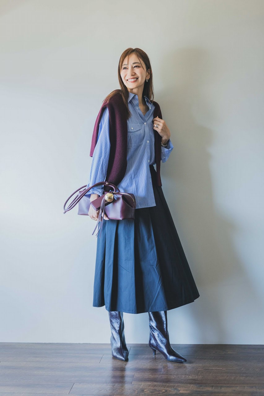 「この秋の一推しはトラッドムード漂うスタイル。爽やかなブルーストライプシャツは襟元を大きく開けてラフに着こなし、垢抜け見えするようバーガンディのニットをアクセントに肩掛けしました。タック入りの膝下丈スカートを合わせれば、上品なコーディネートに仕上がります。さらにバッグとブーツをレザーで統一し、秋らしい深みを加えシーズンムードを盛り上げました。」