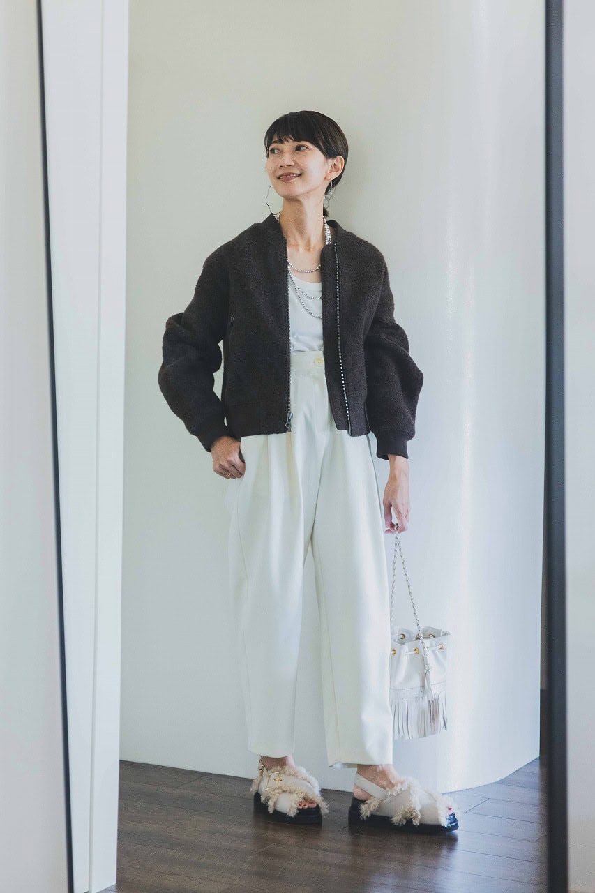 「丸みのあるシルエットが横からの姿も美しく見せてくれるショートブルゾンは、羽織るだけでこなれ感を演出してくれる優秀アウター。つい定番の黒を選びがちですが、この秋はトレンドカラーのブラウンをセレクトして新鮮さをプラス。さらに他のアイテムをオールホワイトでまとめれば、ブラウンがぐっと引き立ち、洗練された大人のおしゃれ感を際立たせてくれます。」
