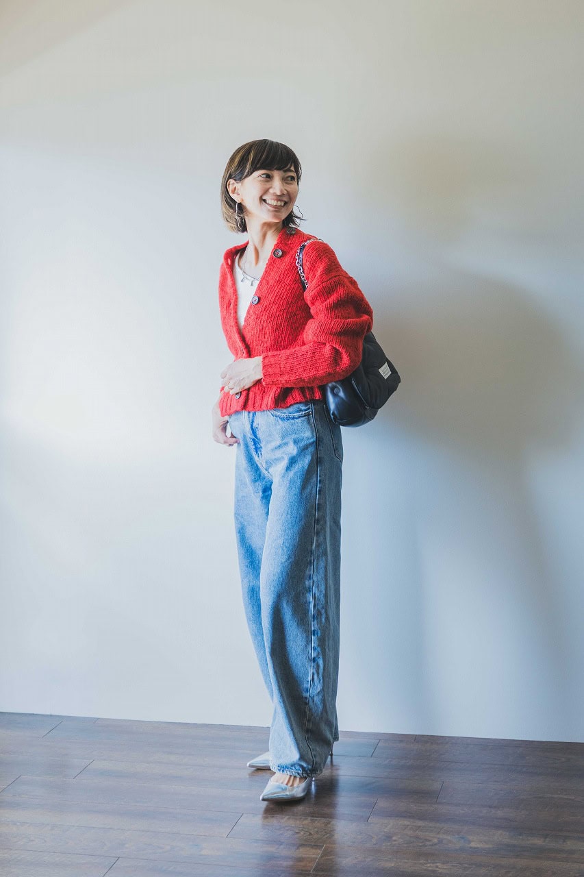「軽やかな着心地が魅力のメリノウールカーディガンは、ざっくり大きめに着たくてLサイズをセレクト。秋はダークトーンに偏りがちだからこそ、鮮やかな赤のカーディガンをデニムにプラスしました。さらにチェーンバッグとパンプスを合わせれば、カジュアルになりすぎず、程よいきちんと感見えする大人のカジュアルコーデに仕上がります。」