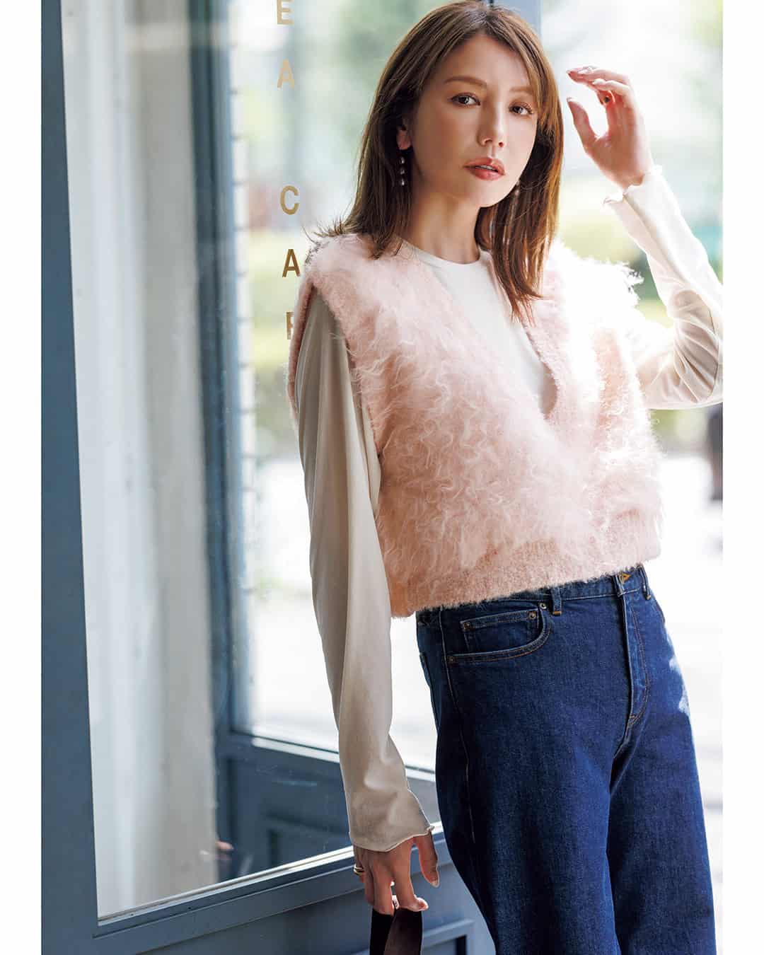 ジレ¥9,790(スパン)ニット¥18,920(アンクレイヴ/アンクレイヴ〈オンワード樫山〉)パンツ¥23,100(コエル/ビッグヒット)バッグ¥53,900(オルセット/オルサ)シューズ¥19,800(ル タロン グリーズ/ル タロン グリーズルミネ新宿店)ピアス¥61,600(モニス/フォーティーン ショールーム)リング¥73,700(マリハ)