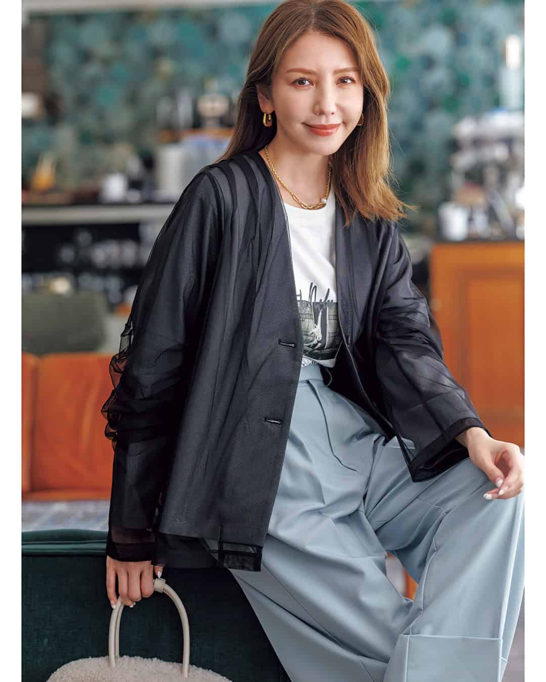 チュールジャケット¥20,900(シークレット・トロフィー)ロゴTシャツ¥9,790(アルページュストーリー)パンツ¥23,100(マイストラーダ)バッグ¥14,300(ツル バイ マリコ オイカワ)ピアス¥4,290(ieLS/ロードス)ネックレス¥30,800(ココシュニックオンキッチュ/ココシュニック)