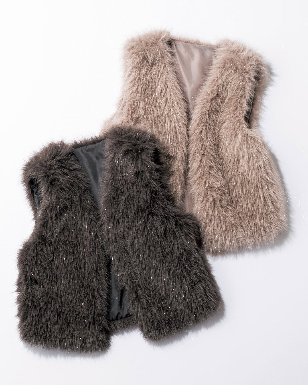 ファーにラメが施されたラグジュアリーなジレ。コンパクトなので、デイリーに着回ししやすく、手持ちのトップスに羽織るだけで、一気に秋コーデへとスイッチ。